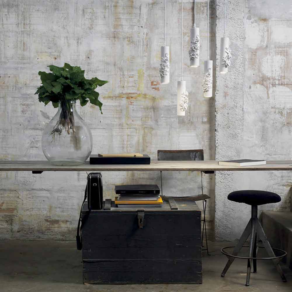Der einfache Keramikzylinder ist in einen Blumenwind gewickelt, der durch die Reinheit der Stillinien und des Materials hervorgehoben wird. Es gibt keine Exzesse, das perfekt ausbalancierte Design kann somit in verschiedene Kontexte eingefügt werden, von den modernsten für einen Hauch von purer Eleganz bis zu den klassischsten und industriellsten, für eine zeitgemäße Atmosphäre und einen Kontrast, der begeistert.