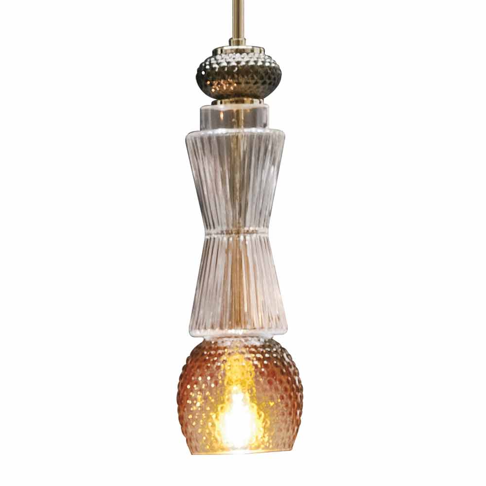 Hängelampe aus Muranoglas mit goldenen Details und Stoffkabel, Made in Italy.