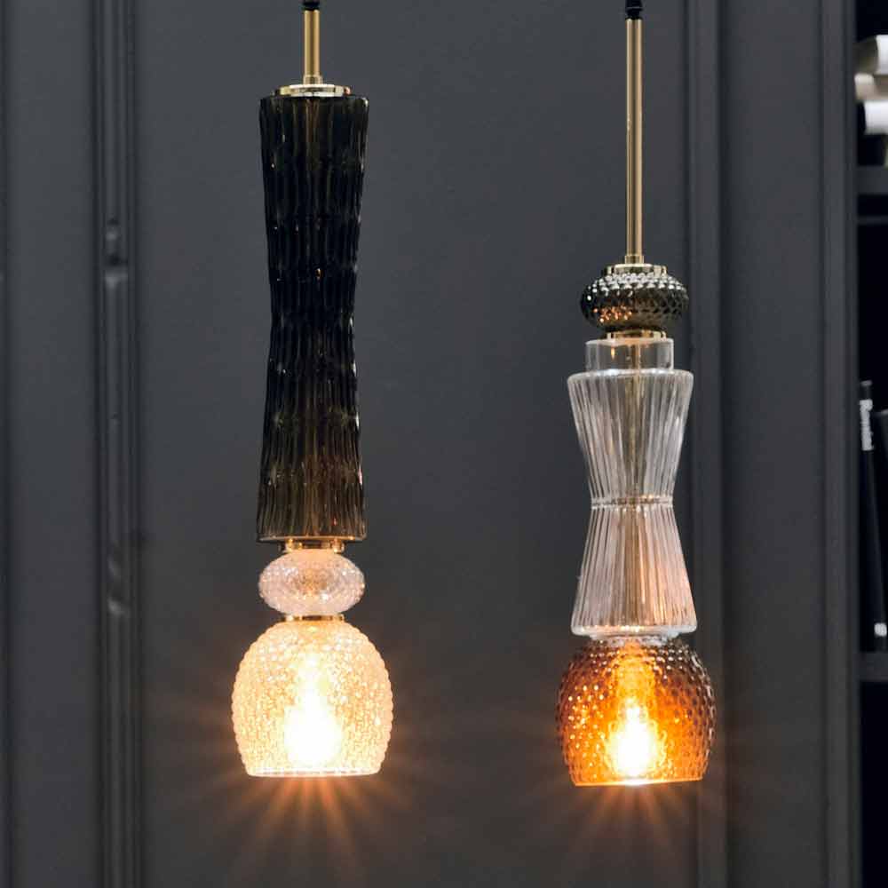 Pendelleuchte aus Muranoglas mit antikem Dekor, Details aus Gold und anthrazitfarbenem Stoffkabel , hergestellt in Italien. Das Zusammentreffen der zeitlosen Eleganz von Muranoglas und der raffinierten Note der goldenen Elemente lässt eine besonders innovative Einrichtungslösung lebendig werden, da sie in der Lage ist, Moderne und Tradition zu einem exklusiven und avantgardistischen Ergebnis zu vereinen, das sowohl moderne als auch klassische Räume mit Persönlichkeit. Dank der Wahl des Spiels mit geometrischen Formen und verschiedenen Oberflächen entsteht eine Idee einer Beleuchtung mit dynamischer Wirkung , die eine warme und einladende Atmosphäre schafft und gleichzeitig die Ästhetik des Raumes bereichert.