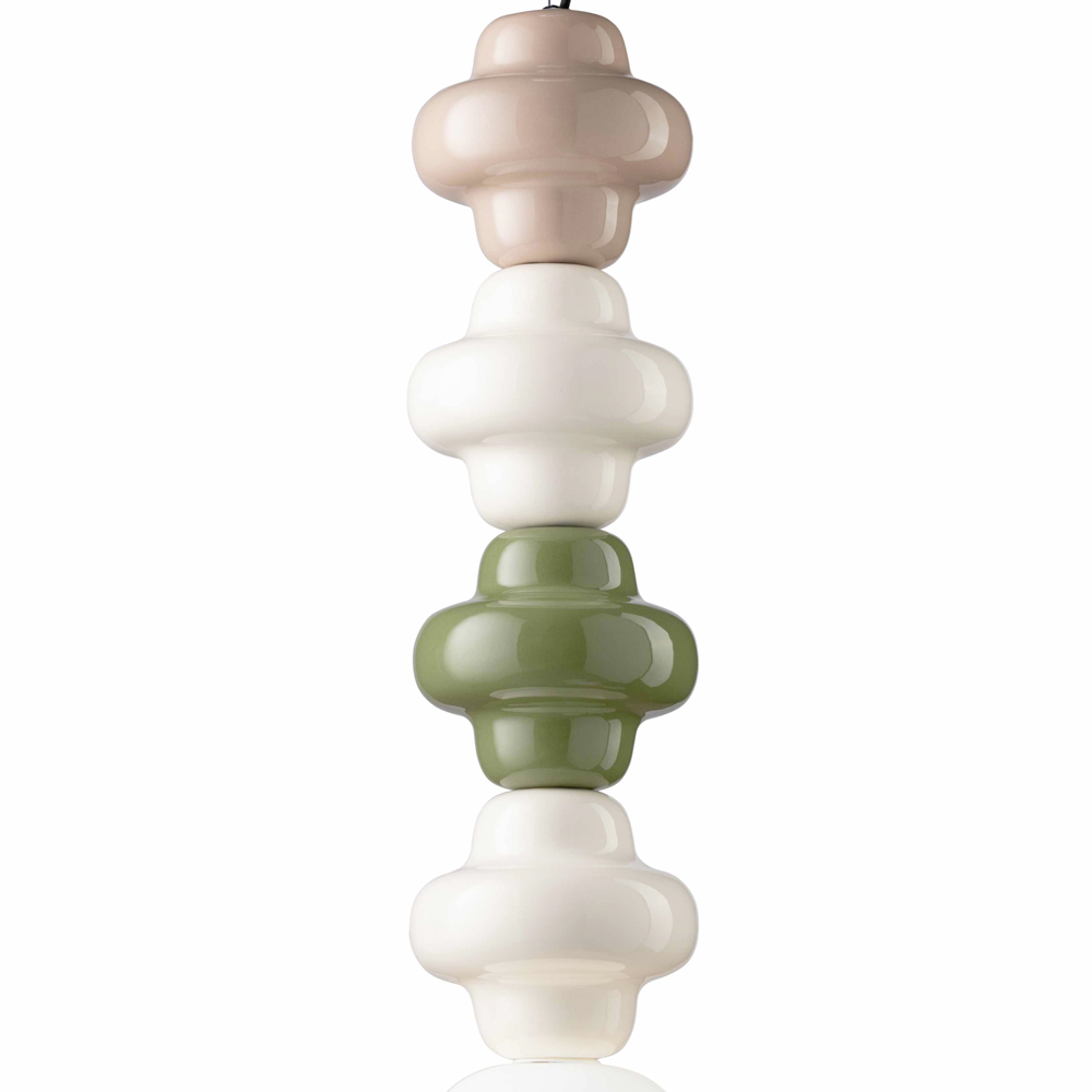 Hängeleuchte aus 4 farbigen Keramikelementen , Diffusor aus satiniertem Opalglas und ummanteltem Baumwollkabel, vollständig in Italien hergestellt.