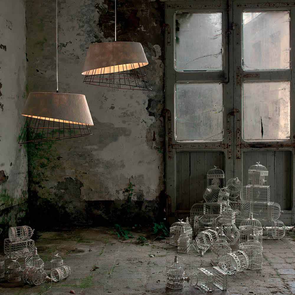 Die Lampe besteht aus weißem Fiberglas , einem Material, das mit seinem kulturellen und technischen Hintergrund in Erstaunen versetzen kann, und einem Diffusor aus rostigem Metallgitter.