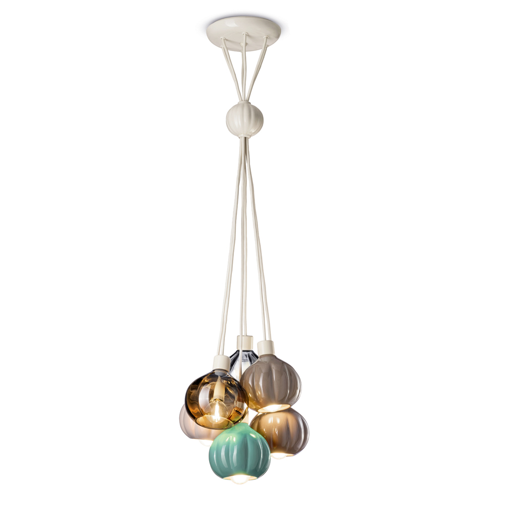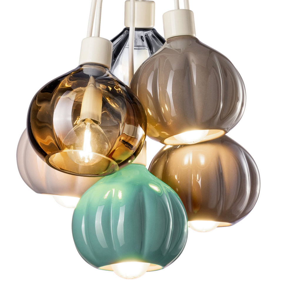 Diese Pendelleuchte ist ein wahres Meisterwerk der Lichtkunst und vereint die Tradition der Keramik mit der Modernität des Glases in perfekter Verbindung. Die Glaskugeln, jede in einem anderen Farbton, sind eine Hommage an das chromatische Selaròn der Natur, vom Bernstein des Sonnenuntergangs über das Grün der Bäume bis hin zur Transparenz von reinem Wasser. Keramik verleiht mit ihrer weichen und leuchtenden Textur einen Hauch von Wärme und Authentizität und erinnert an die handwerklichen Wurzeln des italienischen Designs.