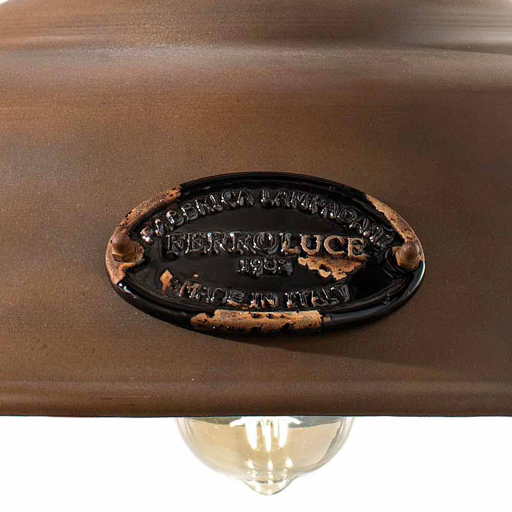 Diese schöne Leuchte besteht aus einem großen Diffusor aus antikisiertem Metall, speziell aus Eisen im Corten-Rost-Finish.