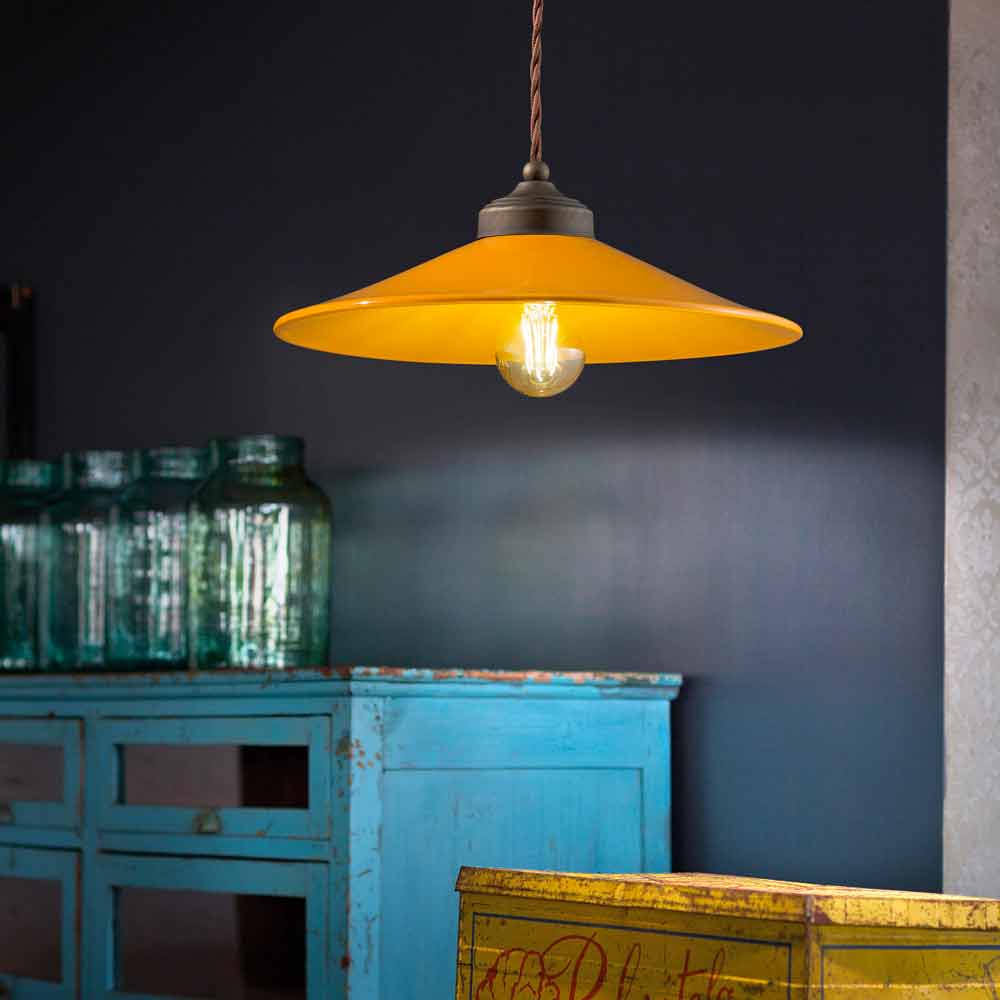 Farbige Keramik passt gut zu antikem Messing und diese Verbindung ist die Stärke dieser Leuchte.