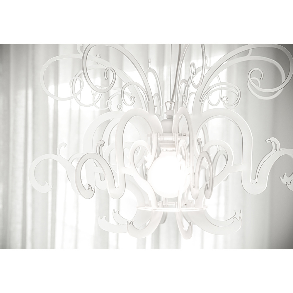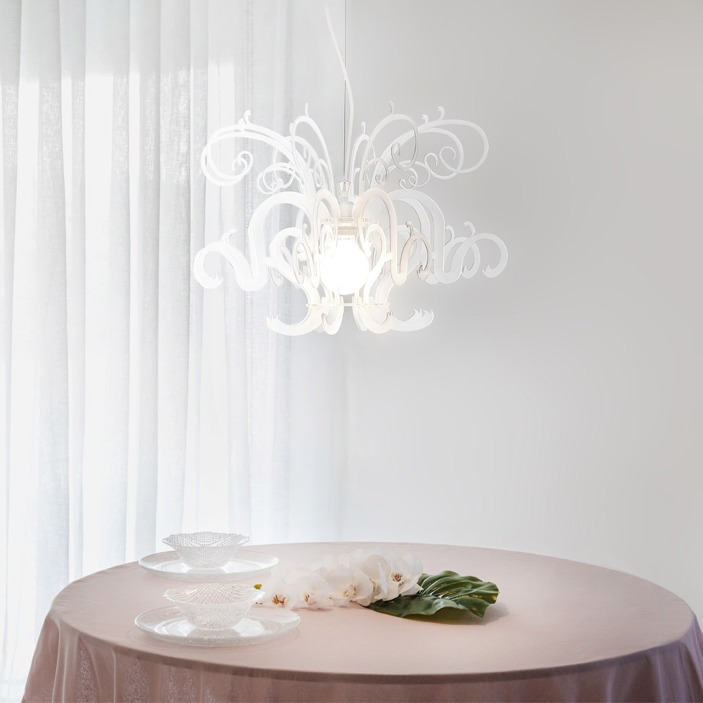 prächtige und hocheffektive Hängeleuchter wird fachmännisch durch Linien und Formen geschaffen, die die außergewöhnlichen optischen Eigenschaften der Lichtdurchlässigkeit des