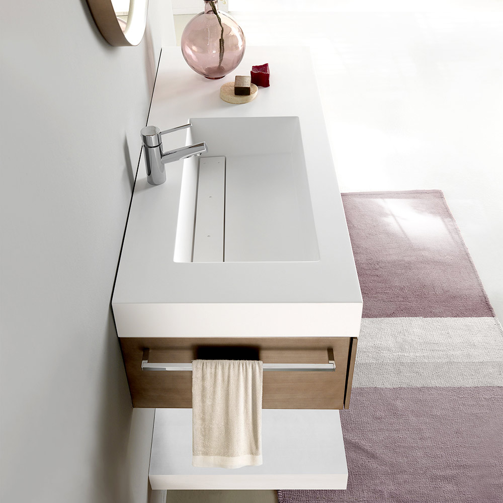 integriertem Becken mit freiem Ablauf, bedeckt von einer raffinierten Platte aus dem gleichen Material.