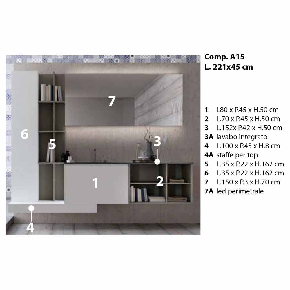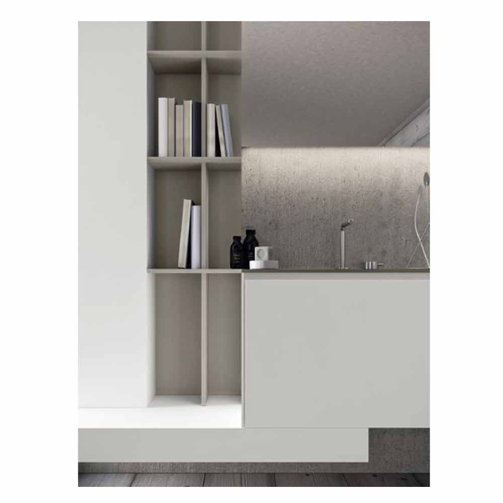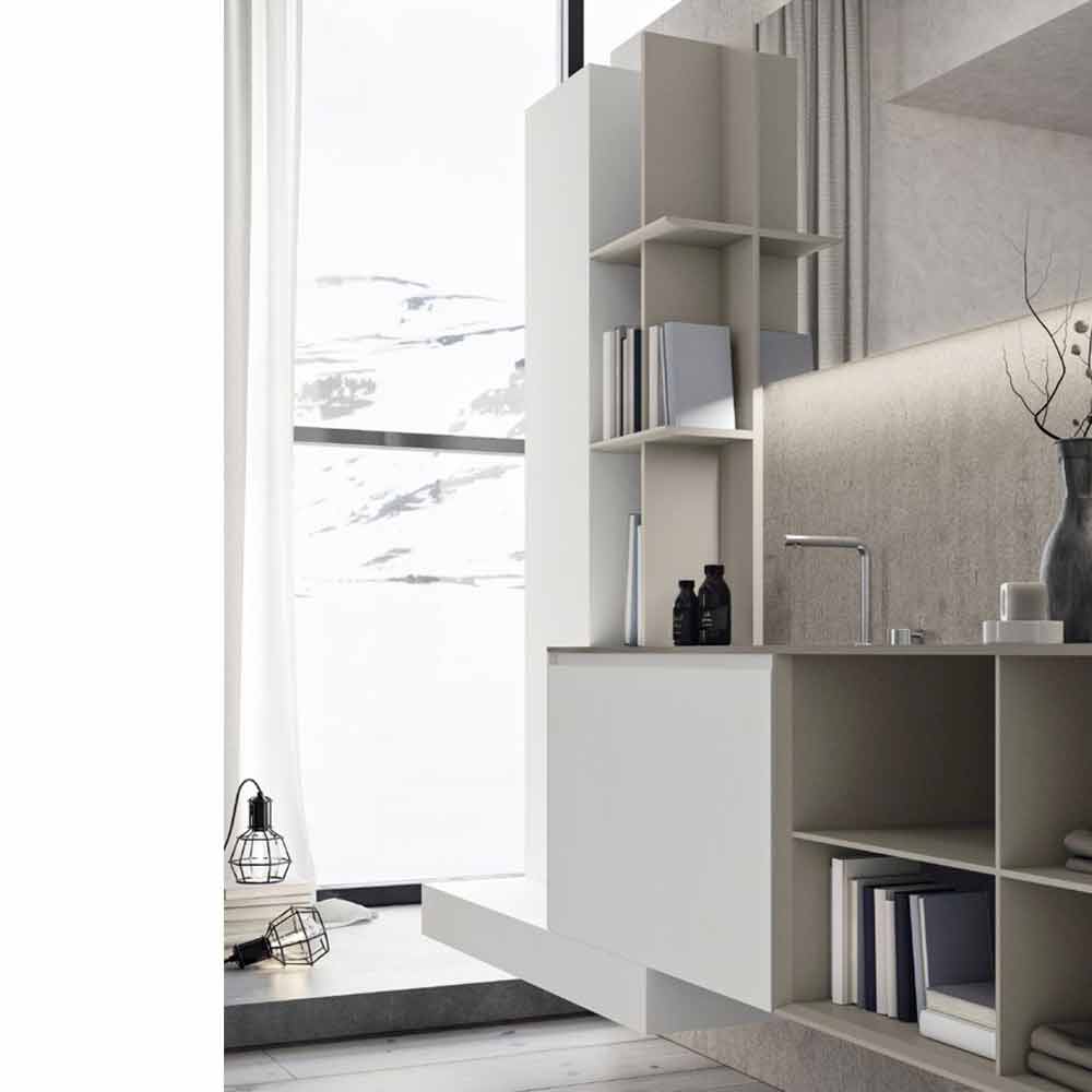 Moderne hängende Badezimmerkomposition, reguläres Design mit offenen Regalen, hergestellt in Italien.