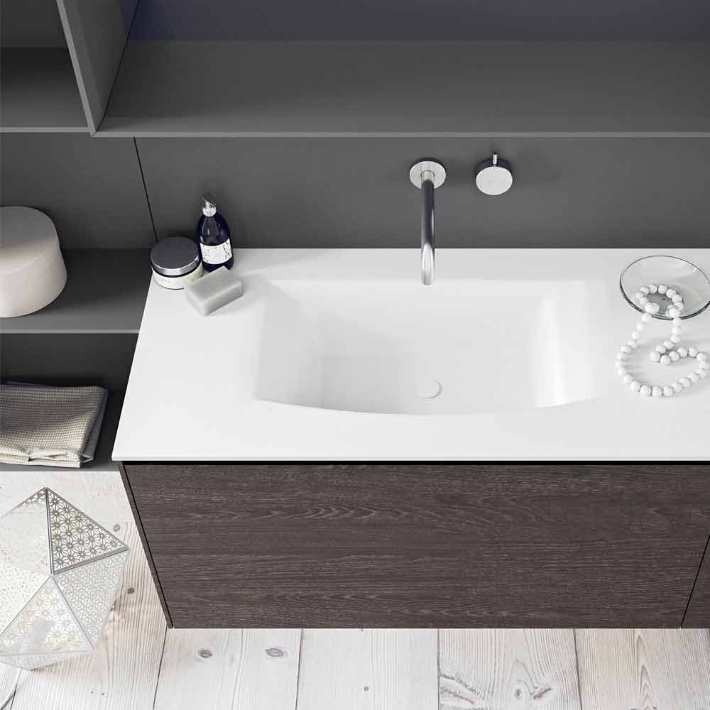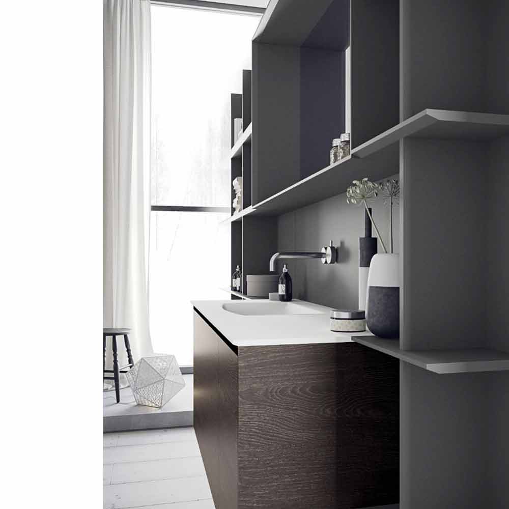 Einfarbiges HPL- Badset aus gebrannter Eiche, integriertes Waschbecken aus mattweißem Teknorit, offenes Element aus mattem dunkelgrauem Lack.