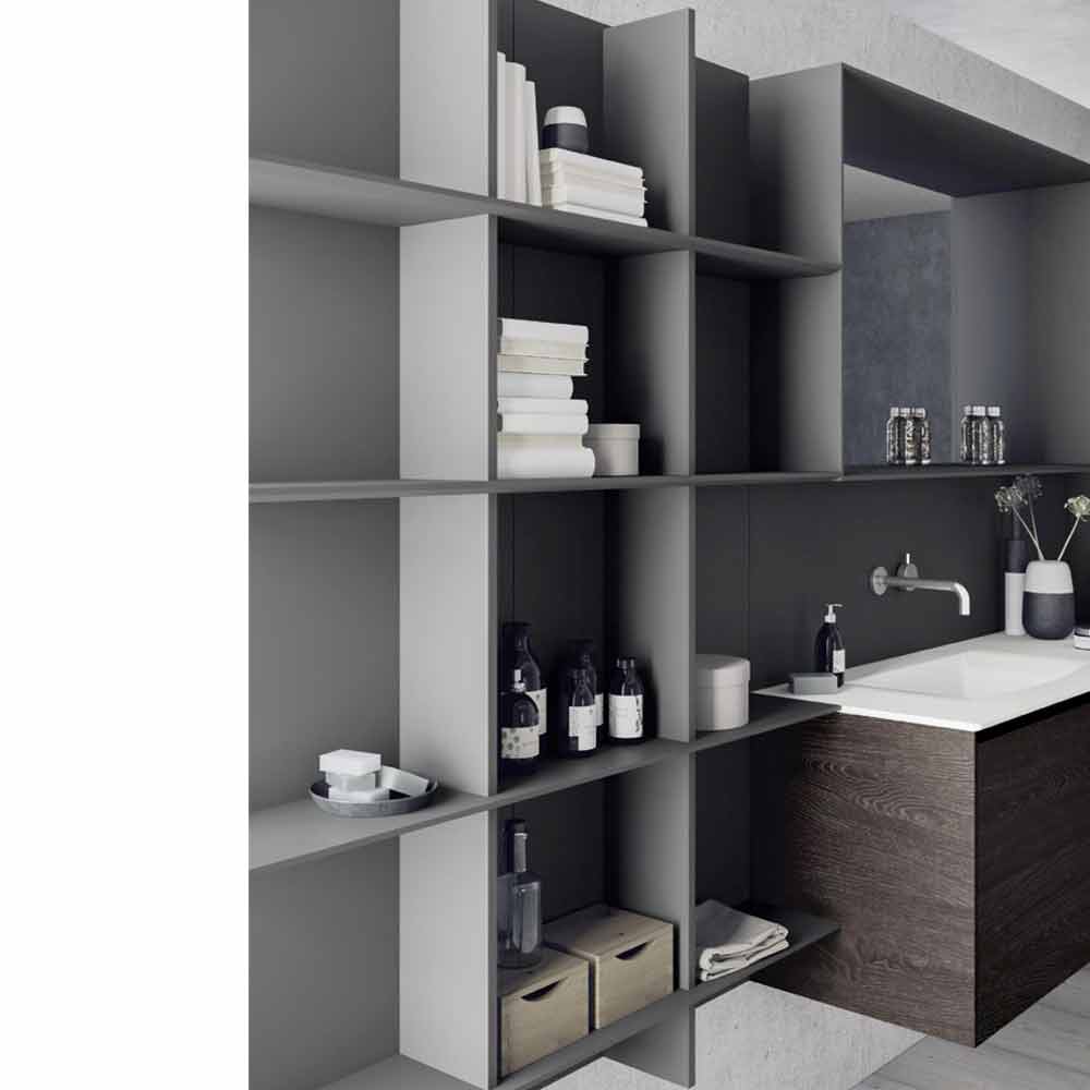 Moderne Badezimmerkomposition, hängendes und regelmäßiges Design mit offenen Regalen, hergestellt in Italien.