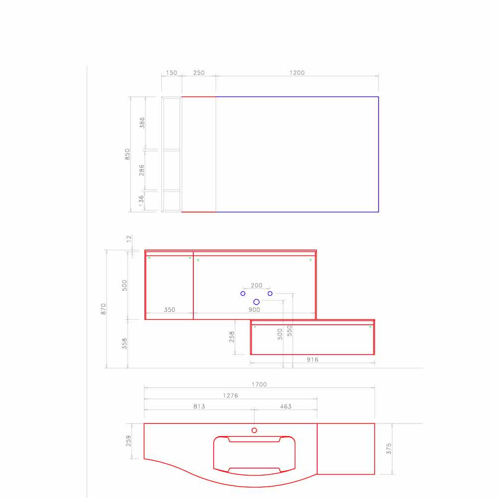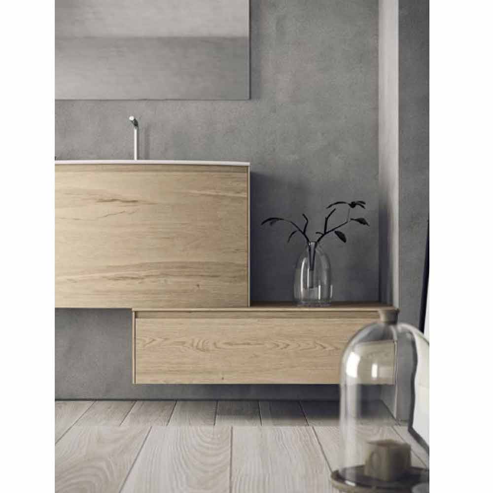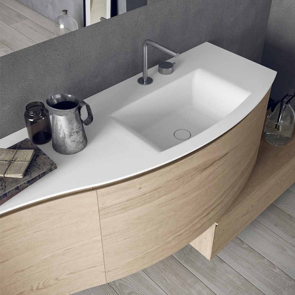 Die Besonderheit dieser Zusammensetzung wird durch das eingebaute Waschbecken gegeben, das durch zwei seitliche Seiten gekennzeichnet ist, die sanft zum Becken hin abfallen, und durch die darunter liegende gekrümmte Wandeinheit, die die Regelmäßigkeit der Struktur für eine einladendere Atmosphäre unterbricht.