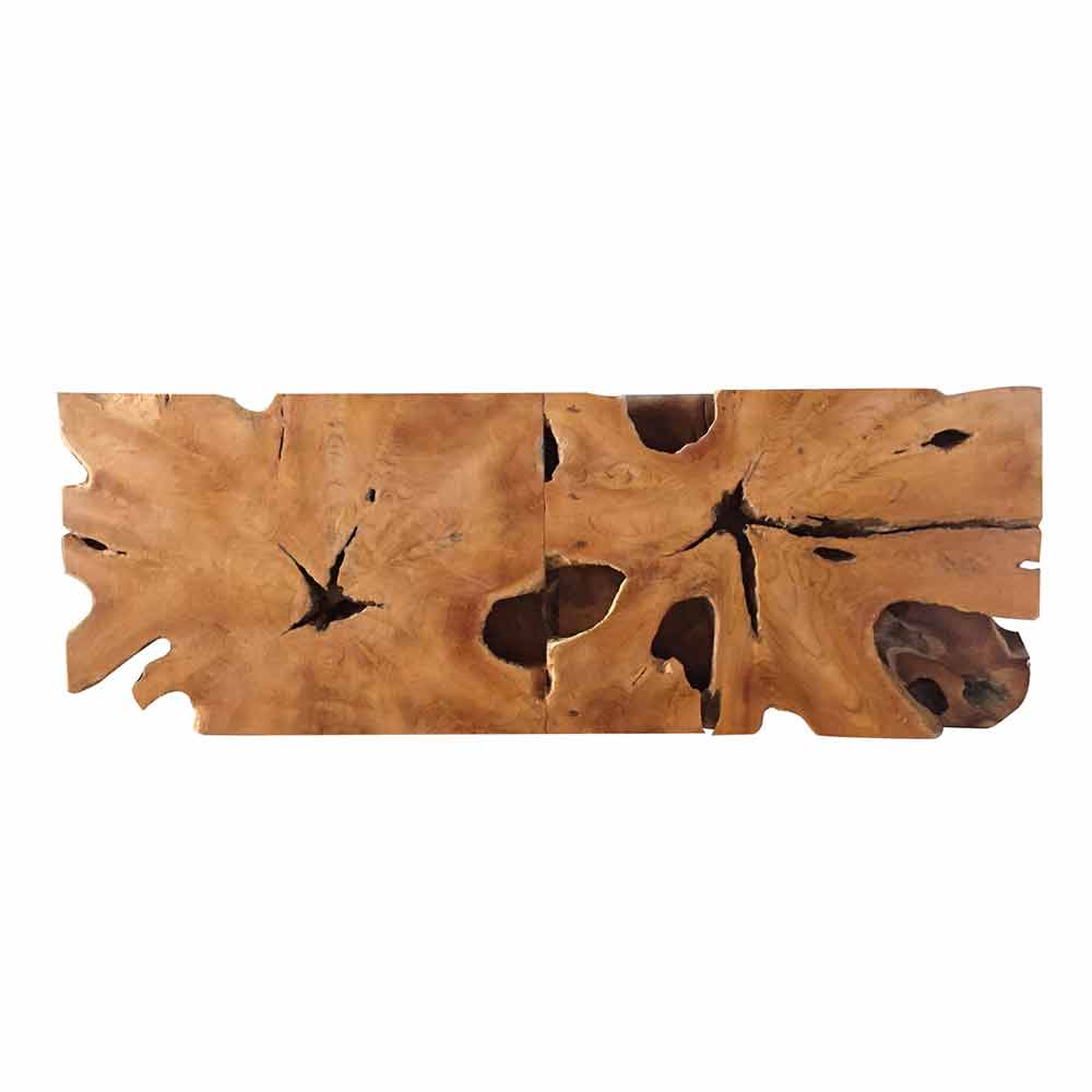 massivem Teakholz, das wiedergewonnen und zusammengefügt wurde. Durch die rechteckige Form der Oberseite bleiben jedoch alle Merkmale des verwendeten Stammes bzw. der verwendeten Wurzel deutlich. Die Äste des Holzes und die Veredelung der Äste, die Unregelmäßigkeiten des Stammes und die Farbschattierungen zeichnen auf jeder Spitze