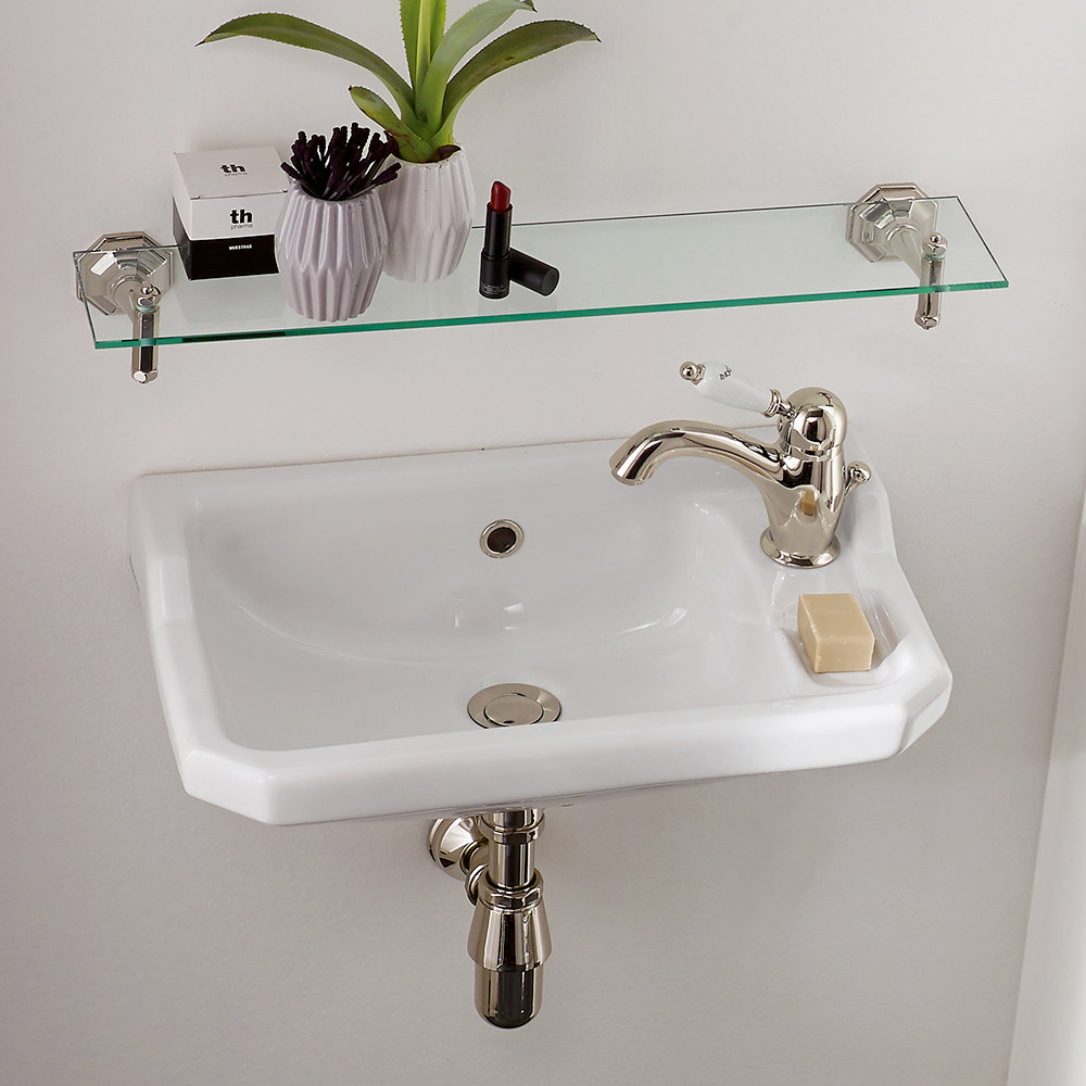 Raffiniertes und elegantes Wandwaschbecken, bereit für eine seitliche Hahnarmatur, L 500 mm. Dieser Artikel wird vollständig in Italien in Keramik hergestellt.