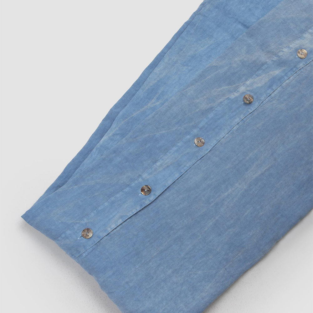 Der Wert der Tradition wird mit dem modernen Lebensstil in diesem hellblauen Bettbezug aus Leinen kombiniert, der mit Perlmuttknöpfen und einer Klappe aus Agoya verziert ist.