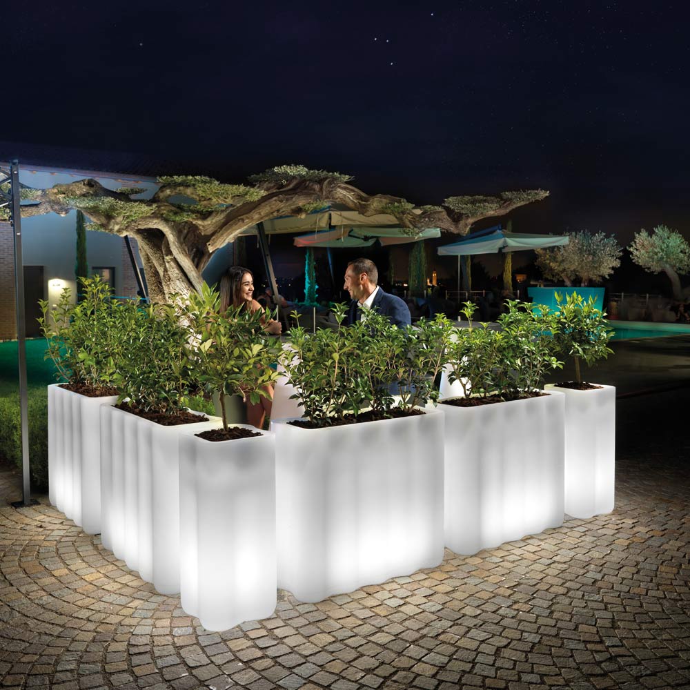 Die leuchtende Außenvase aus perlmuttfarbenem Polyethylen , hergestellt in Italien . Das integrierte LED-Licht verwandelt diese Außenvase in ein Einrichtungsaccessoire mit weichen und geschwungenen Linien, das eine Idee von klassischem, aber unglaublich elegantem Stil widerspiegelt. Die Struktur enthält auch ein Wasserablaufset, um die maximale Funktionalität und Funktionalität dieses Produkts auszunutzen, ohne das Endergebnis, eine elegante und eindrucksvolle Lichtatmosphäre, zu vernachlässigen.