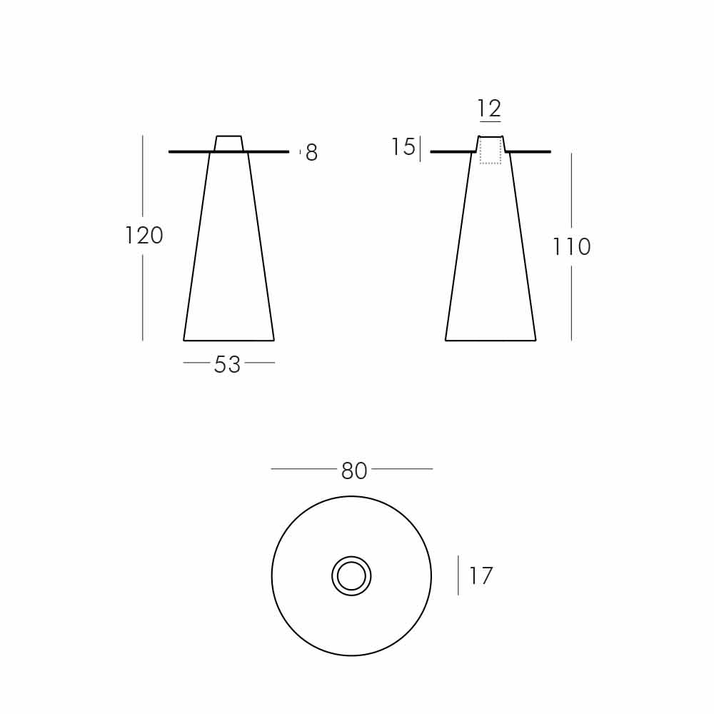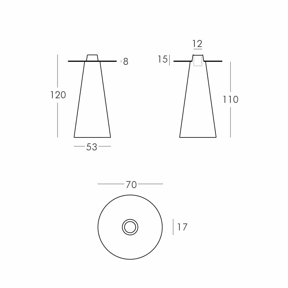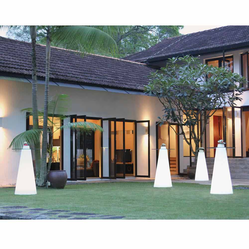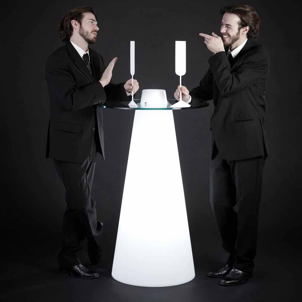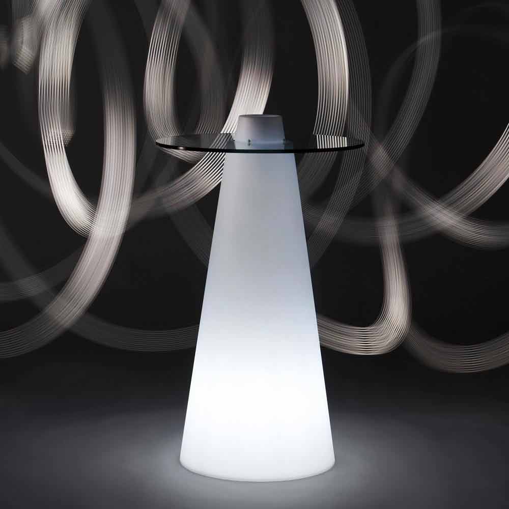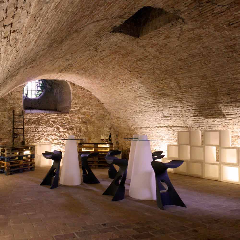 Es besteht aus einer konischen Basis aus Polyethylen und einer runden Platte aus gehärtetem Glas. Nicht gleichgültige Besonderheit ist das zentrale Flaschenfach, ein Detail, das bei besonderen Anlässen den Unterschied ausmachen kann.