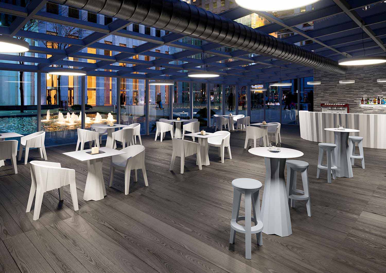 mattem Polyethylen , das Hitze, Sonne und Stößen standhält und das Produkt auch im Außenbereich einsetzbar macht. Der Hocker hat auch eine praktische und bequeme Fußstütze. Das Produkt eignet sich ideal als Sitz für Theken oder hohe Tische und passt sich perfekt an die unterschiedlichsten Stile moderner Möbel an, sodass Sie der Umgebung Persönlichkeit und Charakter verleihen können.