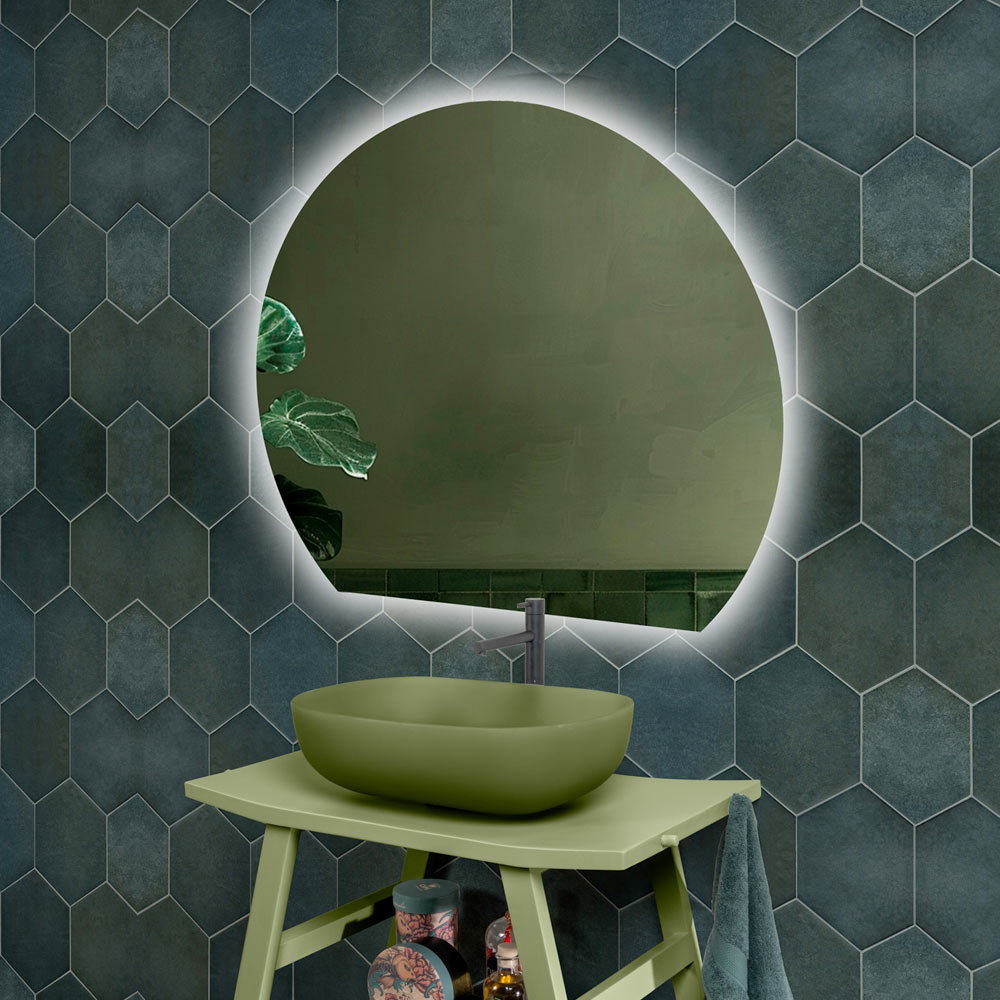 Das integrierte LED-Licht , das gleichmäßig entlang des Umfangs verteilt ist, erzeugt einen weichen Effekt, der die Reinheit der runden Form unterstreicht und zu einer einladenden und raffinierten Atmosphäre beiträgt. Perfekt für die Körperpflege, sorgt es für eine funktionale und zugleich stimmungsvolle Beleuchtung.