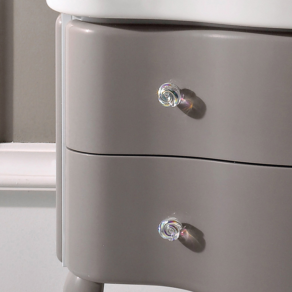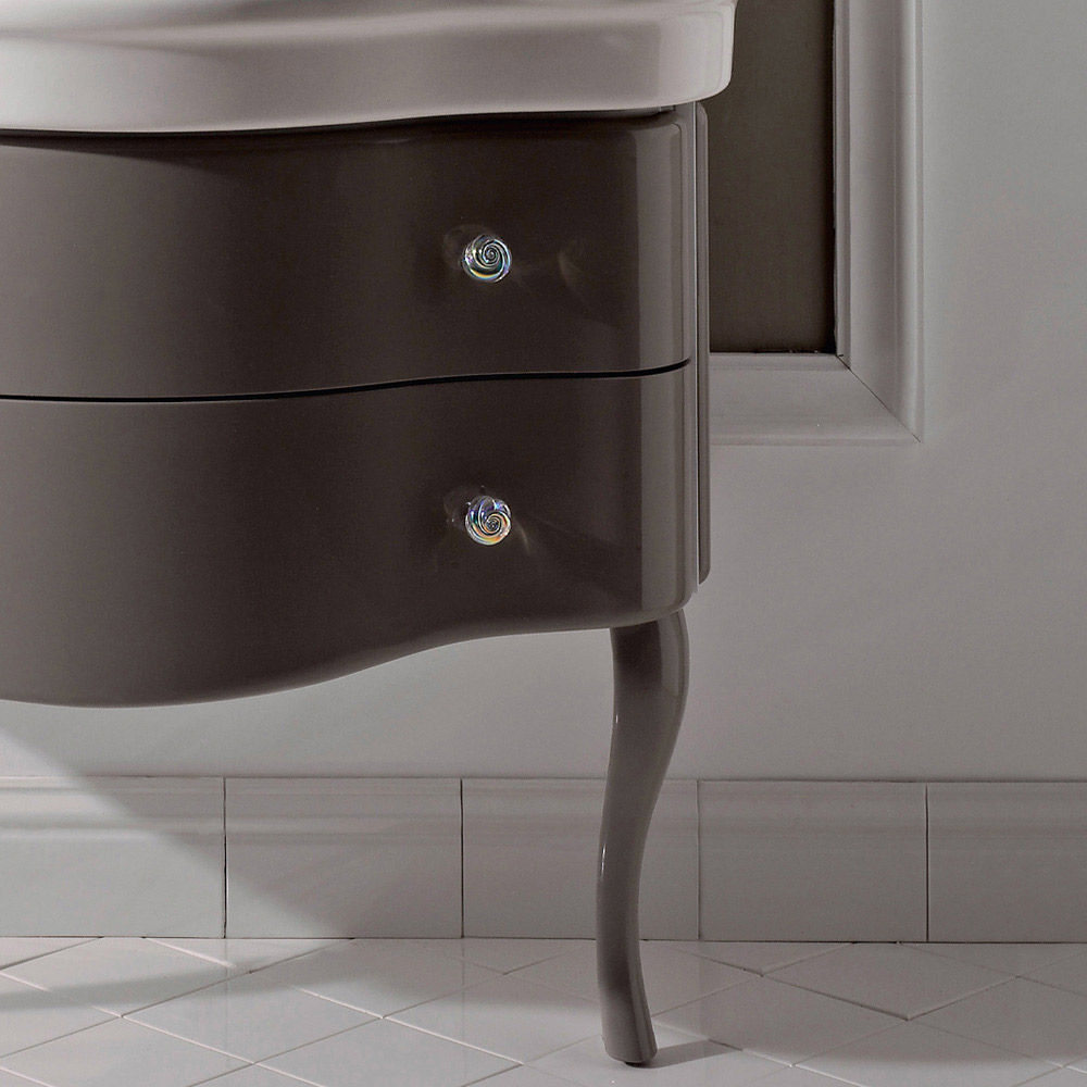 Badezimmerschrank aus MDF mit zwei glänzend lackierten Schubladen und weißem Keramikwaschbecken . Der Schrank ist zweifarbig: Türen und Beine sind taupefarben, während die Struktur weißdornfarben ist, die rosenförmigen Messingknöpfe sind im Lieferumfang enthalten.