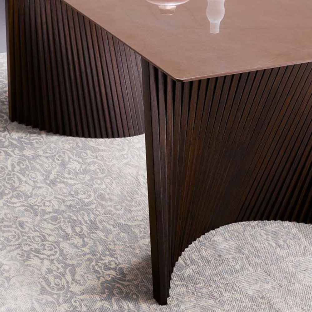 Steinzeugplatte (9 mm Steinzeug, 19 mm MDF), gekennzeichnet durch abgerundete Ecken und Beine aus geölten Lamellen aus