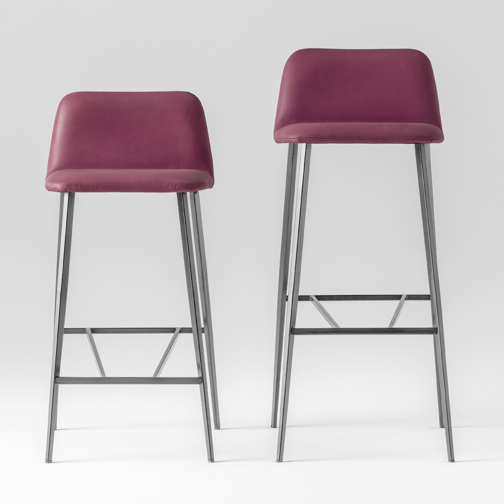 Hoher Hocker aus Italien mit Struktur aus lackiertem Metall mit Blei-Anthrazit-Finish und gepolsterter Schale mit Lederbezug . Ein Stuhl mit einfachen, aber originellen Merkmalen, der sich durch Funktionalität und unvergleichliche Schönheit auszeichnet. Er eignet sich ideal zum Anpassen und Einrichten der Einrichtung von Küchen oder Vertragsumgebungen, um eine raffinierte Atmosphäre und eine wunderbare Harmonie zwischen den Stilen zu schaffen. Dank der Wahl, Leder für die Polsterung zu verwenden, hat dieser Hocker eine besonders faszinierende Seele, die ihm ein nüchternes, diskretes und edles Design verleiht.