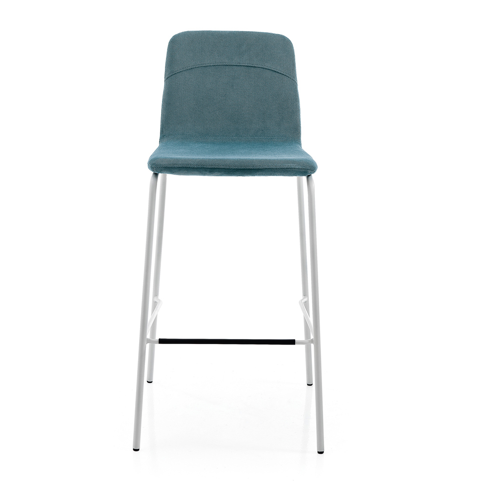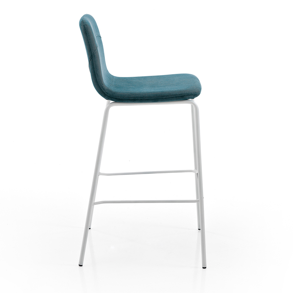 Hoher Küchenhocker made in Italy mit Rundrohr-Metallstruktur (Durchmesser 16 mm) komplett mit praktischer Fußstütze und stoffbezogener Sitzfläche. Ein funktionales und zeitloses Design , geeignet für diejenigen, die eine einladende Umgebung mit zarten Farbtönen schaffen möchten.