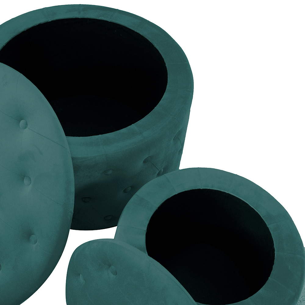 Dieses Set von Aufbewahrungshockern ist die perfekte Ergänzung, um Eleganz und Funktionalität in jedem Raum des Hauses zu kombinieren. Mit einem raffinierten Samtbezug überzogen, zeichnen sich diese Hocker durch ihr geknöpftes Capitoné Design aus, das Ihrem Wohnzimmer, Schlafzimmer oder Eingangsbereich einen Hauch von Klasse und Sophistication verleiht.