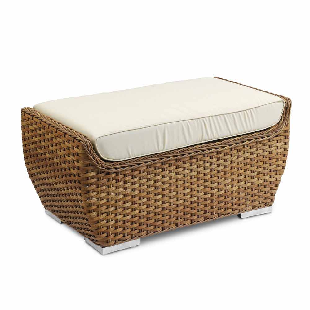 Hocker für den Garten aus feinem, luxuriös gewebtem synthetischem Rattan und weißem oder Ecru-Kissen.