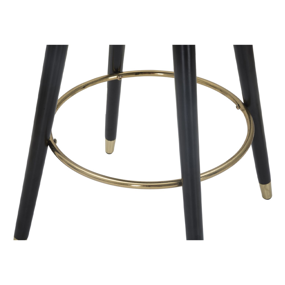 Moderner Hocker aus Holz und Eisen mit Stoffbezug.