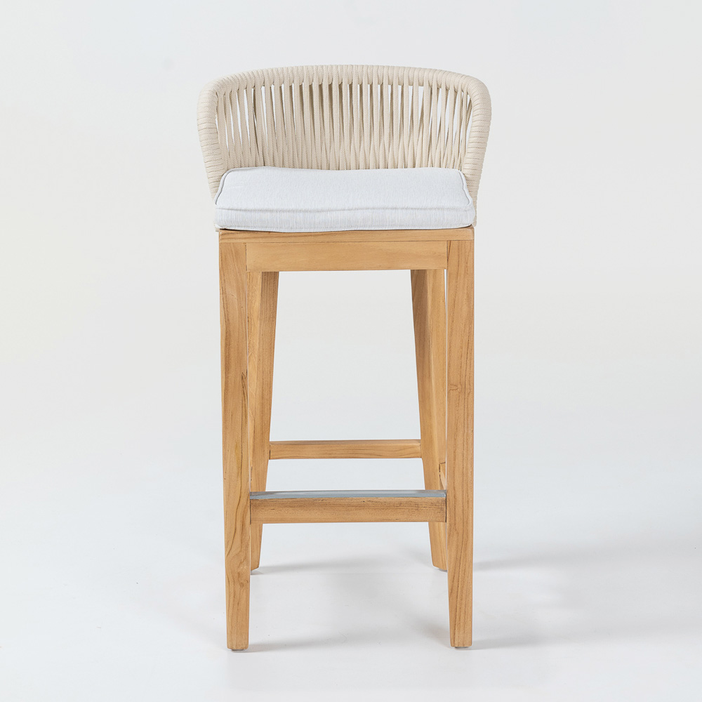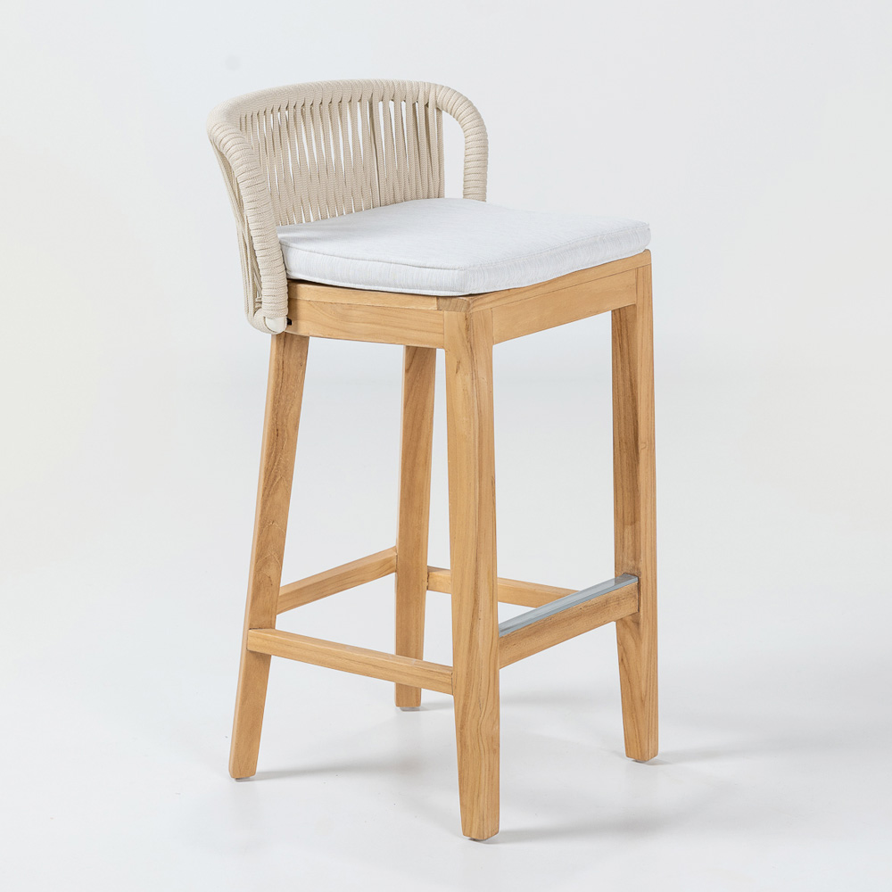 Hoher Barhocker aus naturbelassenem Teakholz und Aluminium, Olefin/PP-Seilgeflecht und Kissen