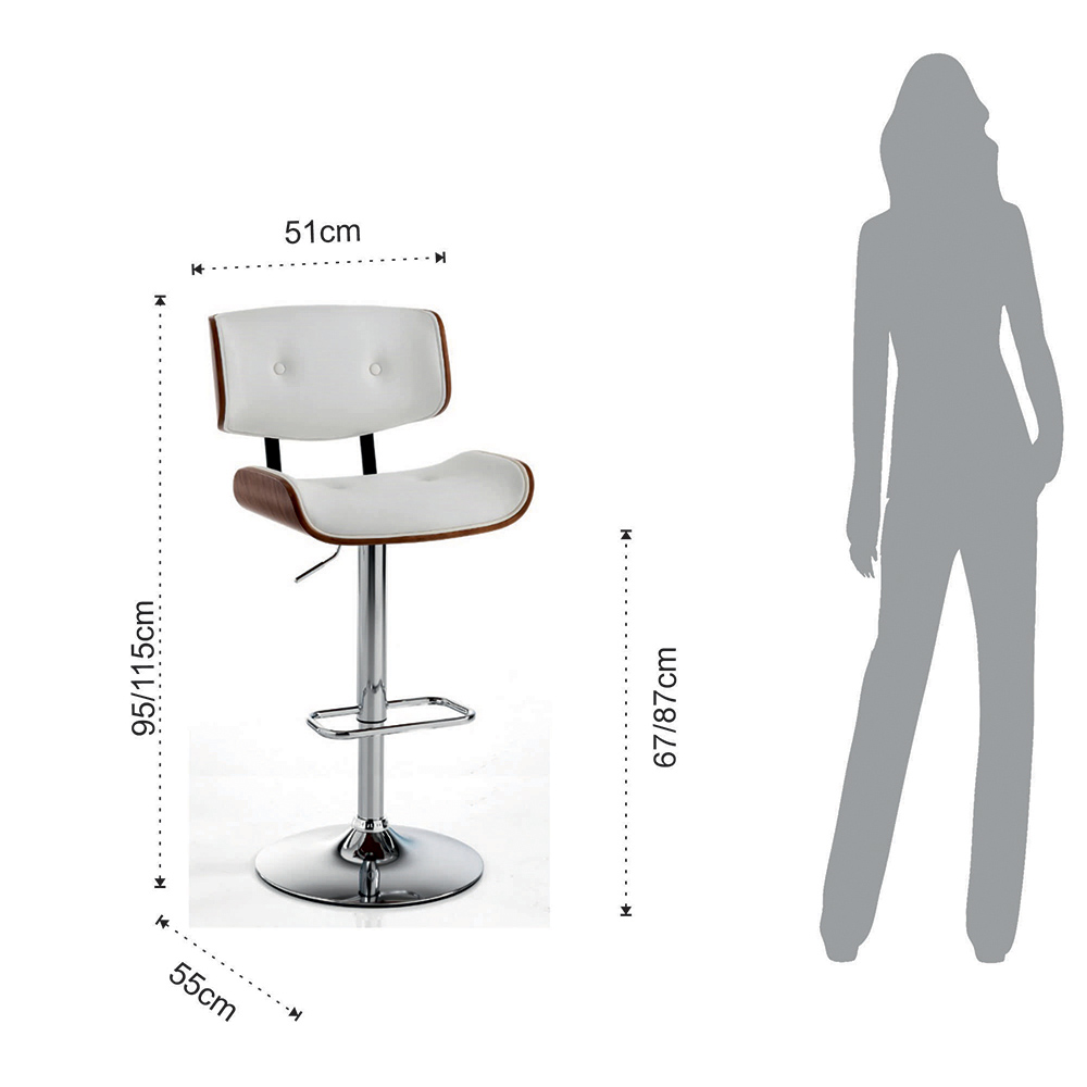 Hoher Küchenhocker mit Untergestell aus verchromtem Metall komplett mit praktischer Fußstütze und Sitz und Rückenlehne aus nussbaumfarben gebeiztem Sperrholz und weißem Kunstleder. Seine Besonderheit stellt der praktische verstellbare Gaslift dar , mit dem Sie die Sitzhöhe bis zu maximal 87 cm anpassen können. Sein Design ist einzigartig und fesselnd und wird von weichen Formen und abgerundeten Linien unterstrichen , die einen bequemen und einladenden Hocker gewährleisten, der ideal ist, um Wohnumgebungen wie Küchen oder Esszimmer, aber auch Bars und Restaurants mit einem modernen Stil zu vervollständigen. Die wunderbare Kombination aus der imposanten Holznote und der zeitlosen Eleganz von Leder erweckt eine originelle , avantgardistische Ergänzung mit einer starken zeitgenössischen Persönlichkeit zum Leben .