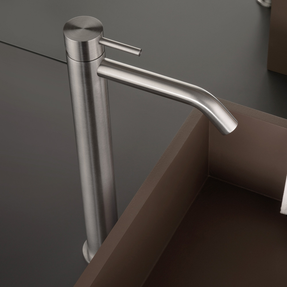 Hoher Waschtischmischer, langer Auslauf, ohne Ablaufgarnitur aus Edelstahl AISI 316L , 100 % recycelbares Material, vollständig in Italien hergestellt.