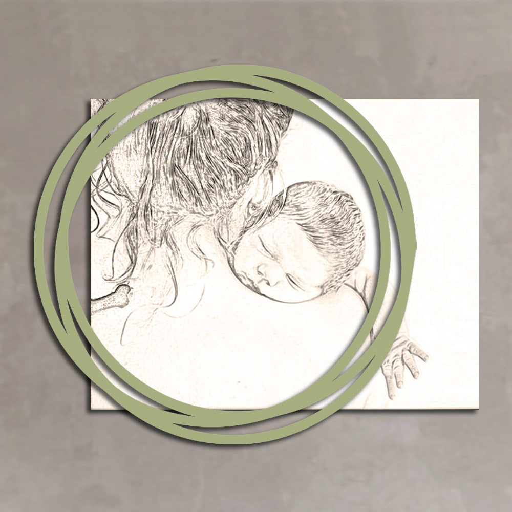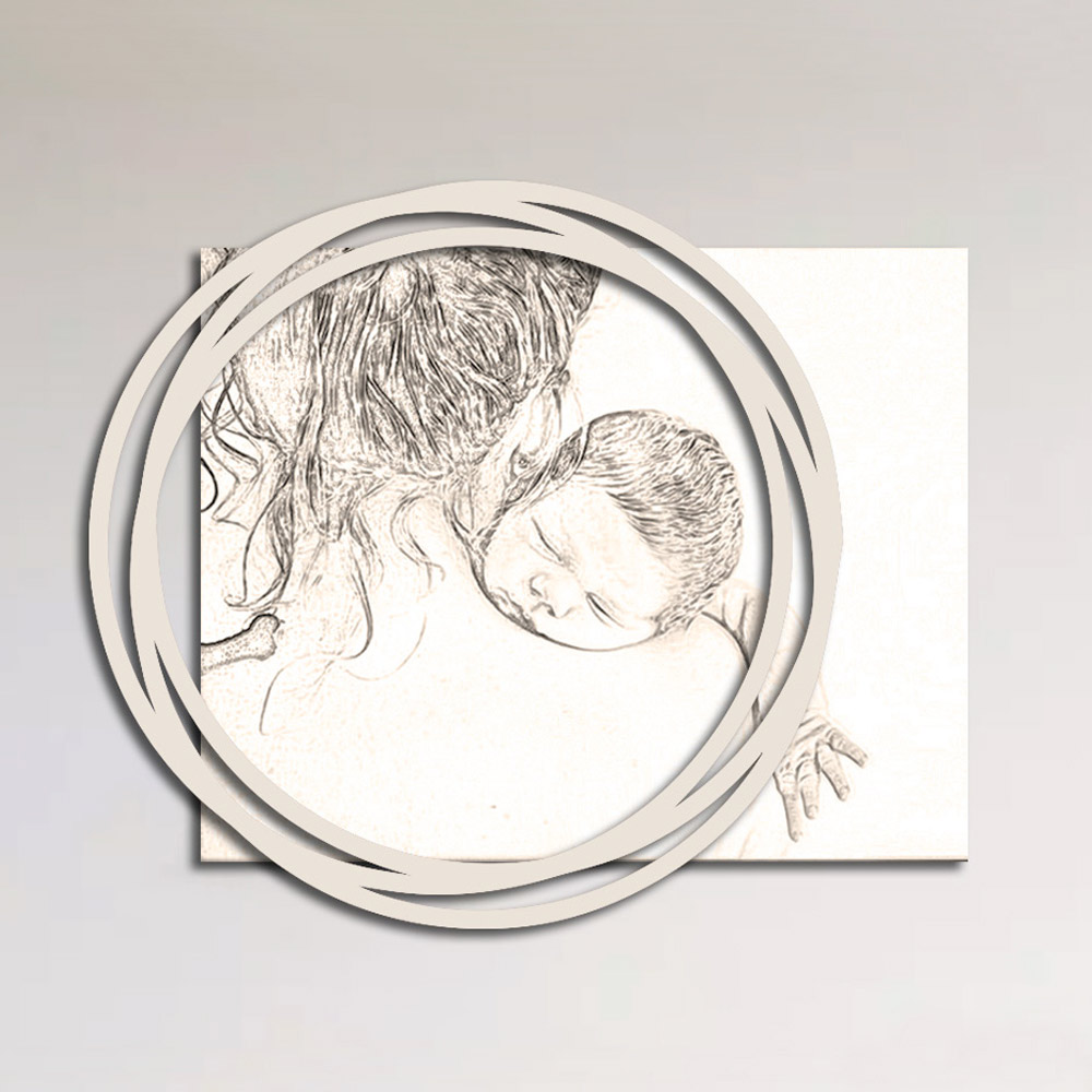 Süße und Zuneigung der Umarmung einer Mutter , hervorgehoben durch den runden Rahmen. Die Oberflächen, das für die Herstellung ausgewählte Holz und die Drucktechnik unterstreichen die