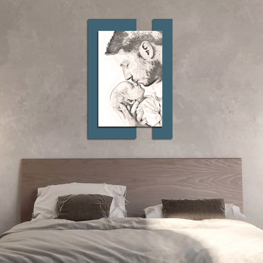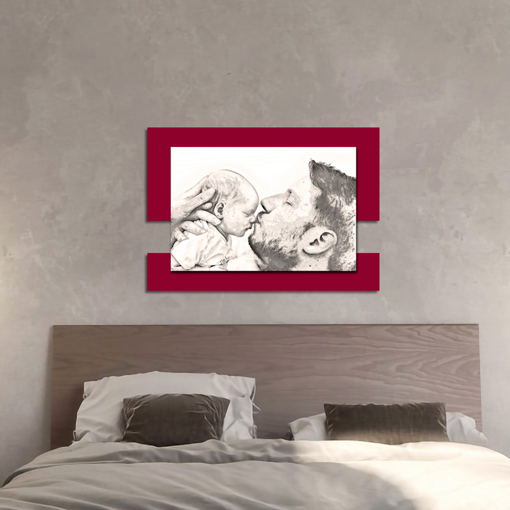 Holz mit dem Aufdruck eines Mannes, der ein Kind küsst. Buchsen zum