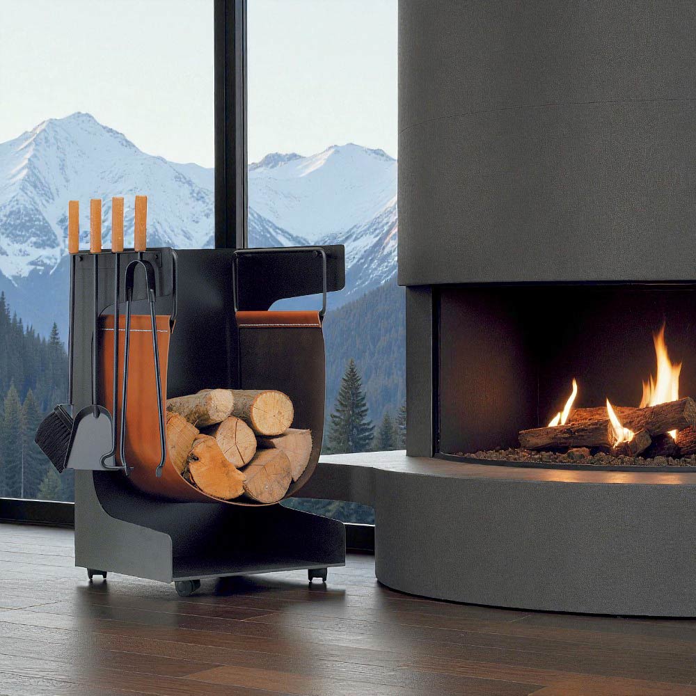 Dieser Holzständer aus Metall vereint Funktionalität und Eleganz. Sein cleveres Design dient nicht nur als praktische Aufbewahrungsbox für Holz, in der Ihre Holzscheite ordentlich und griffbereit aufbewahrt werden, sondern beinhaltet auch ein Set Kaminbesteck , das übersichtlich in vertikalen Halterungen untergebracht ist: eine Bürste, eine Kehrschaufel, ein Haken und eine Klemme .