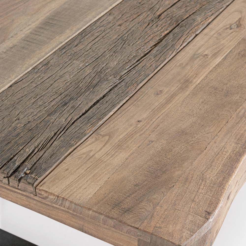 Couchtisch aus Stahl und Akazienholzplatte mit recyceltem Einsatz.
