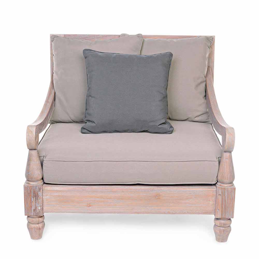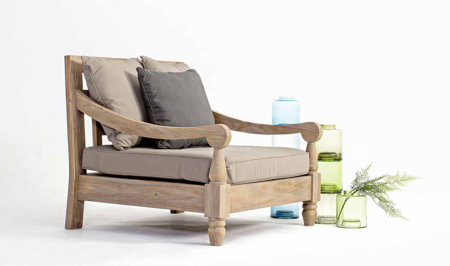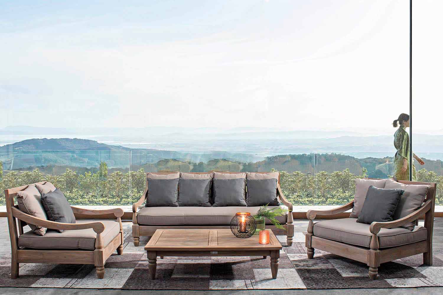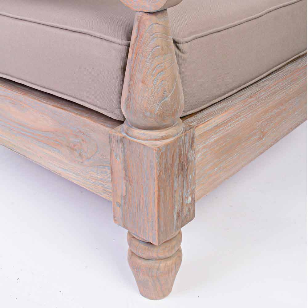100% FSC Teakholz, sandgestrahlt und gealtert auf Wasserbasis. Abnehmbare Kissen aus sonnenfestem Olefingewebe (100% Polypropylen).