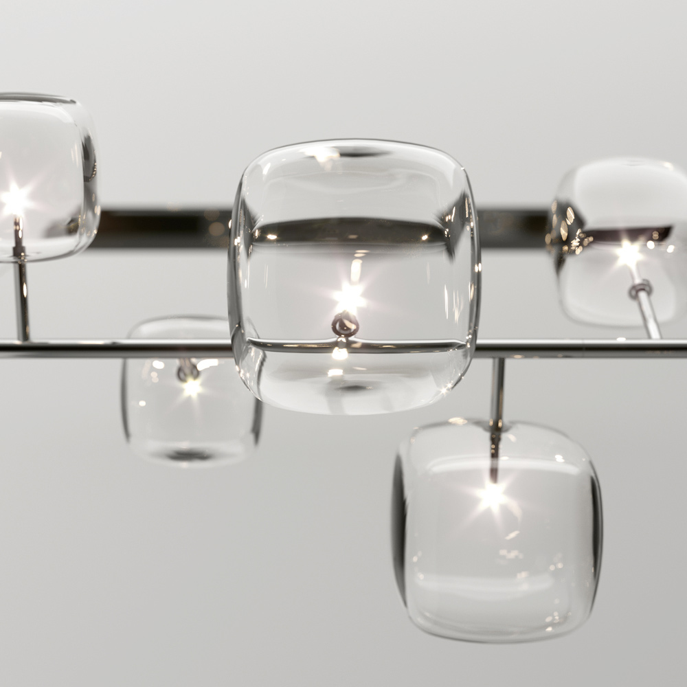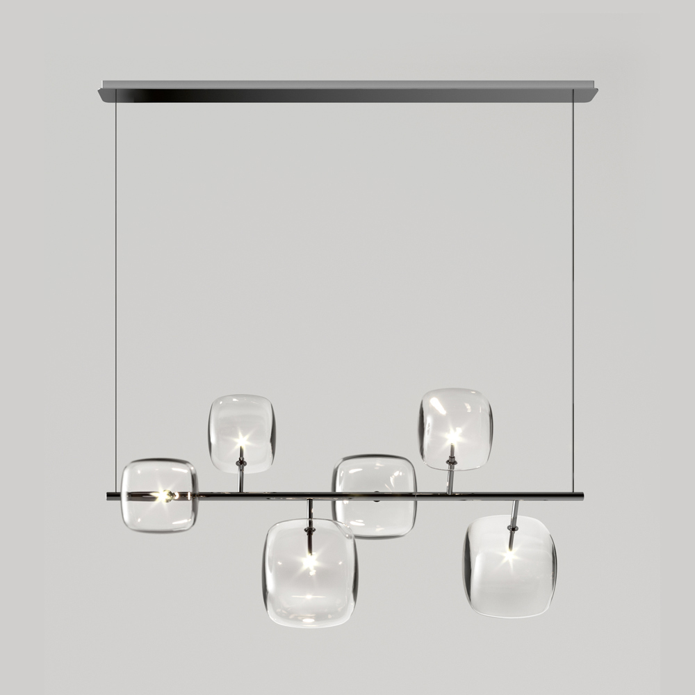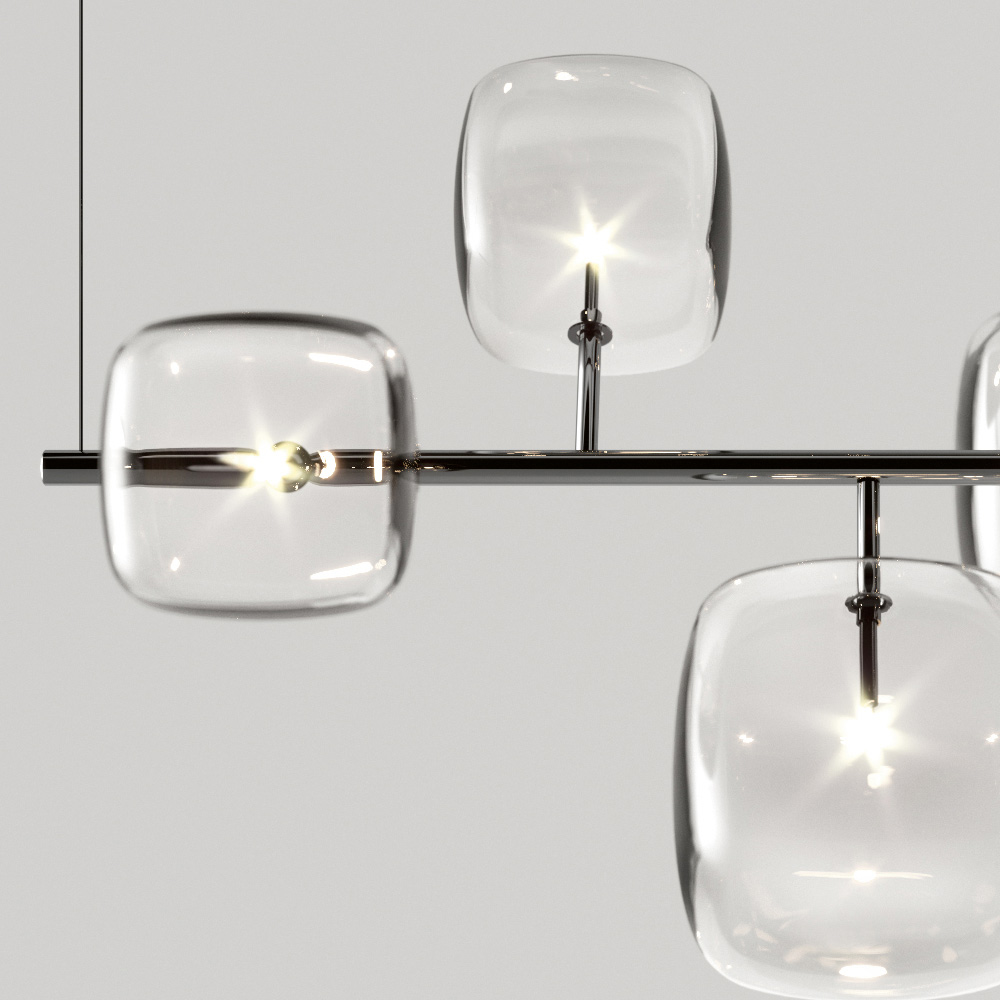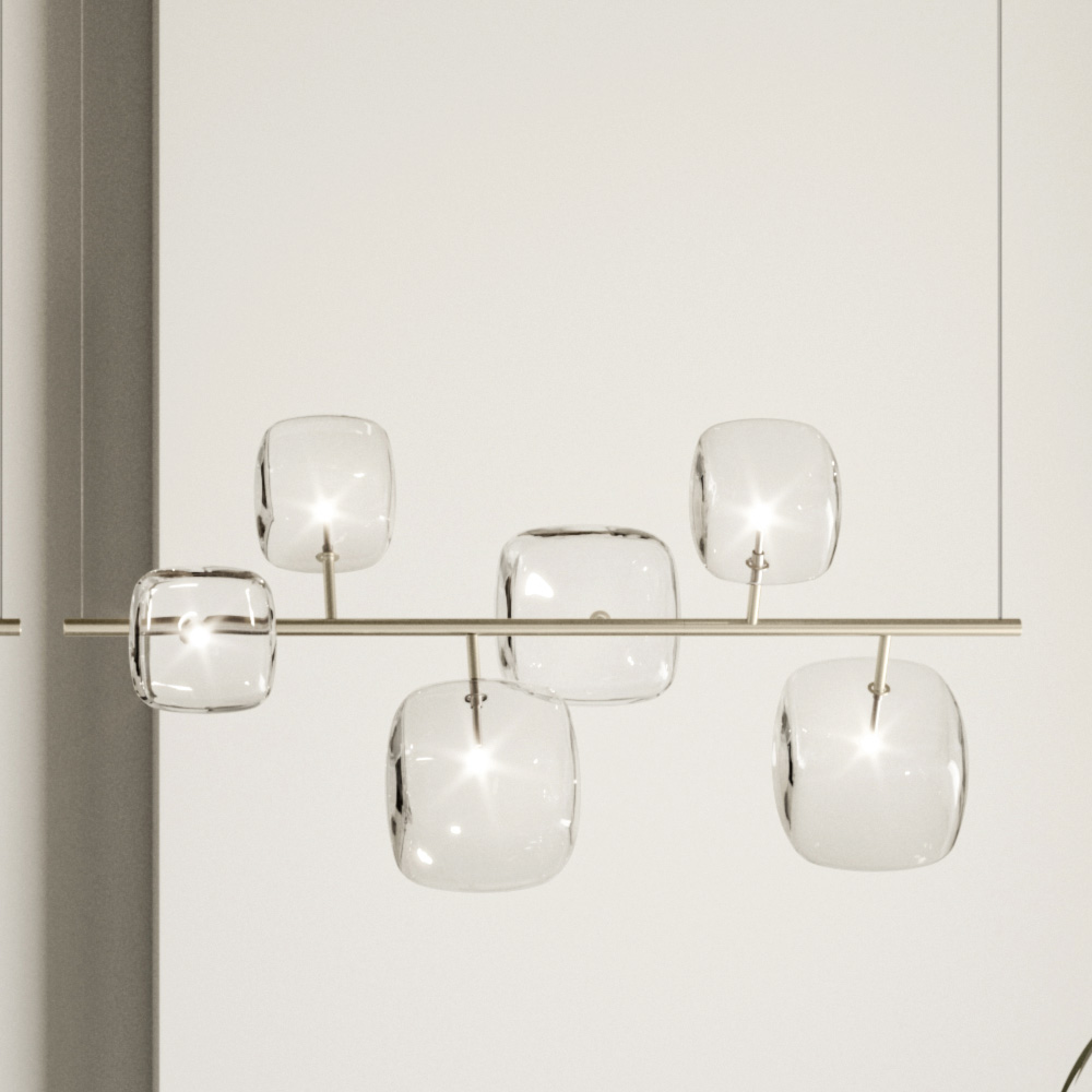 Horizontale Pendelleuchte mit Metallstruktur und 6 kubischen und abgerundeten Strukturen aus transparentem, geblasenem Pyrexglas mit jeweils 1 dimmbaren G4 3000K-LED-Glühbirne im Inneren.