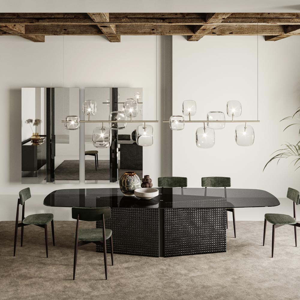 Die Metallaufhängungen und Glaskugeln erzeugen einen optisch anregenden Kontrast, der ins Auge fällt, und machen diesen Kronleuchter zu einer ausgezeichneten Wahl für alle, die ihre Umgebung mit anspruchsvollen Designelementen verschönern möchten. Die Lichtkonfiguration erhellt nicht nur große Räume wie Esszimmer oder Empfangsbereiche , sondern sorgt auch für eine einladende und einladende Atmosphäre.