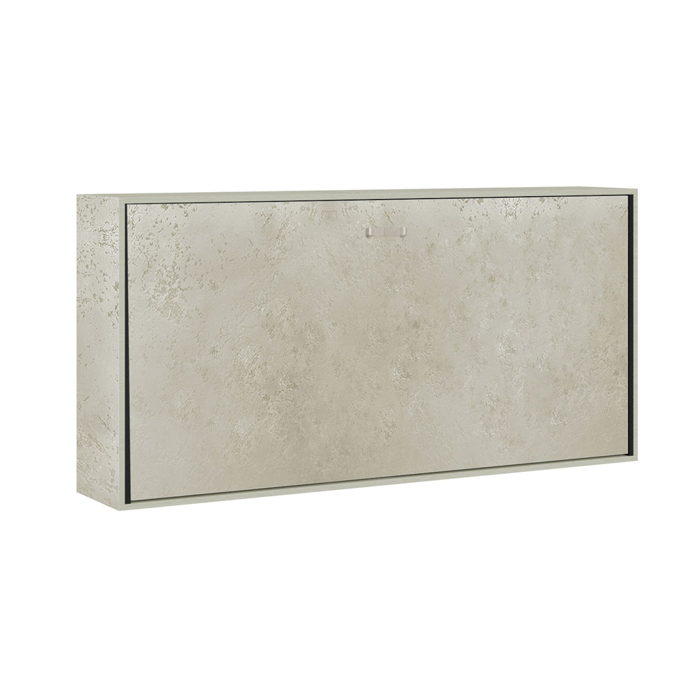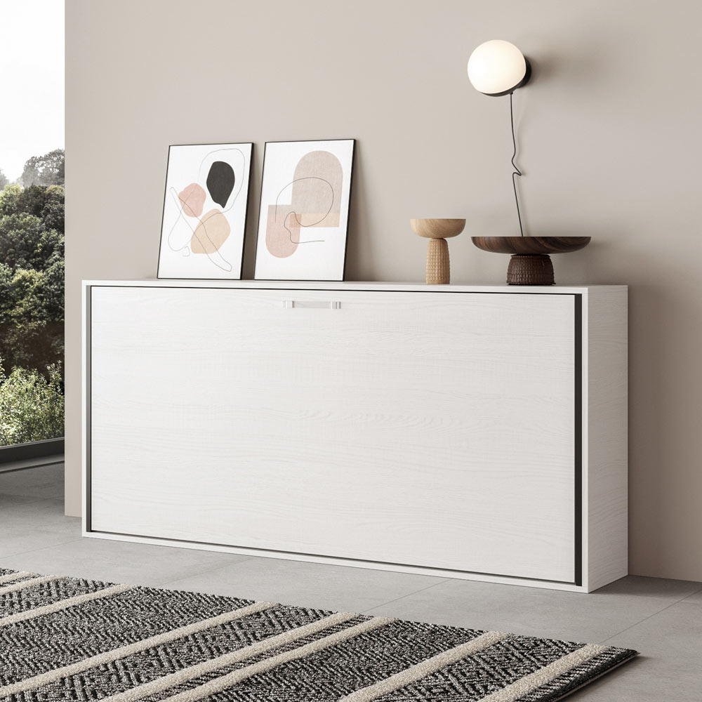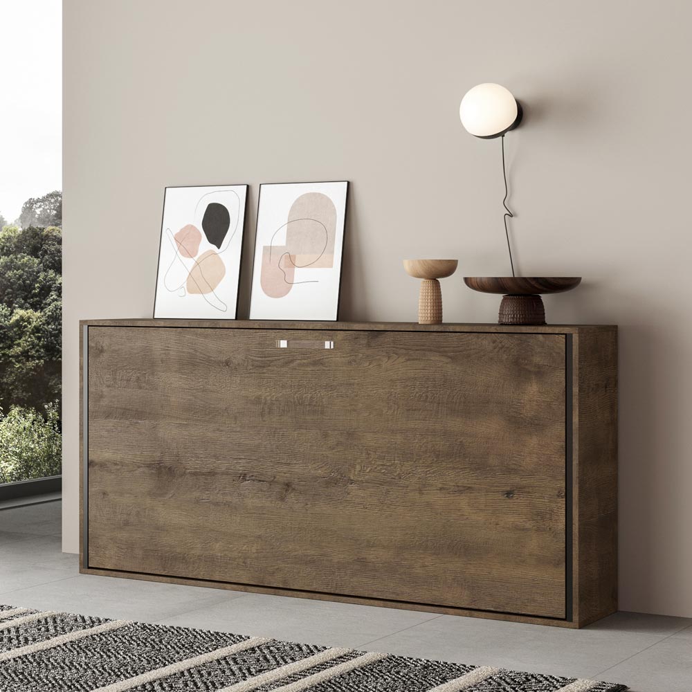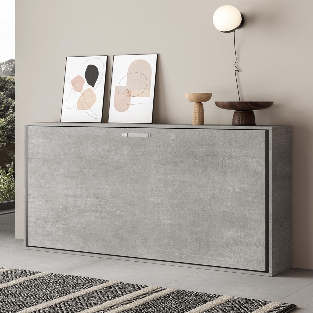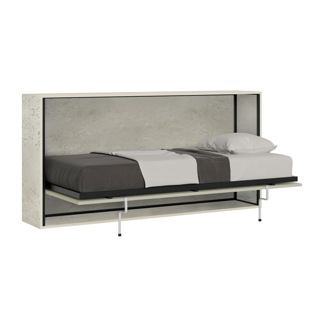 Horizontales Klappbett mit einer Struktur aus 18 mm dicken, veredelten Spanplatten, Bettuntergestell aus verstärktem, mit Epoxidpulver in der Farbe geprägtes Aluminium lackiertem Eisen.
