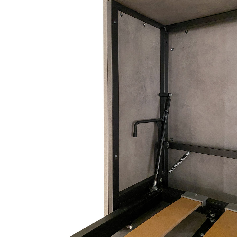 Das Schrankbett wird zerlegt geliefert. Der Aufbau ist sehr aufwendig und erfordert zwei erfahrene Personen. Eine Wandmontage ist zwingend erforderlich. Für weitere Informationen kontaktieren Sie uns über das Formular „
