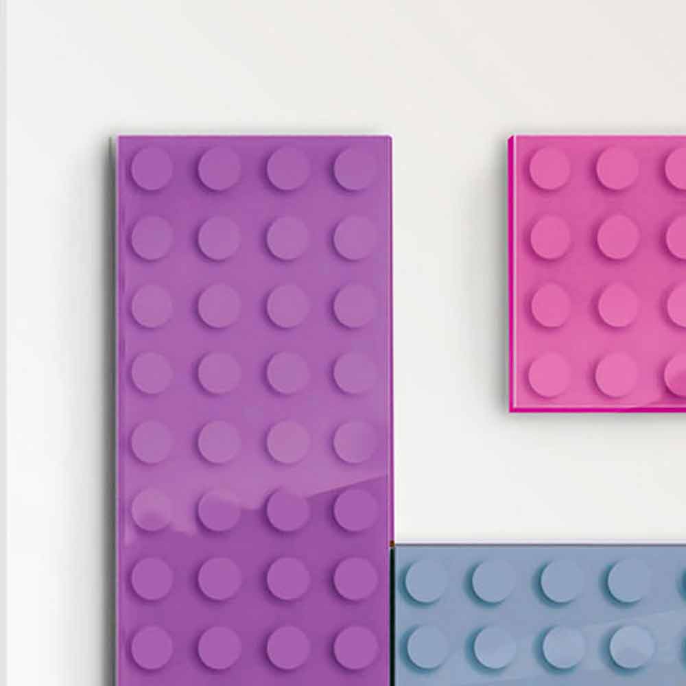 Komposition aus farbigen Heizkörpern in modernem und spielerischem Stil, in der hydraulischen Version. Ein Projekt, das von einer affektiven Ikone inspiriert ist, die alle teilen. Mehrere Farbkombinationen für horizontale und vertikale modulare Elemente. Wie in einem Konstruktionsspiel kombinieren sich die Elemente und platzieren sich je nach verfügbarem Platz und erforderlicher Wärmeleistung nebeneinander.