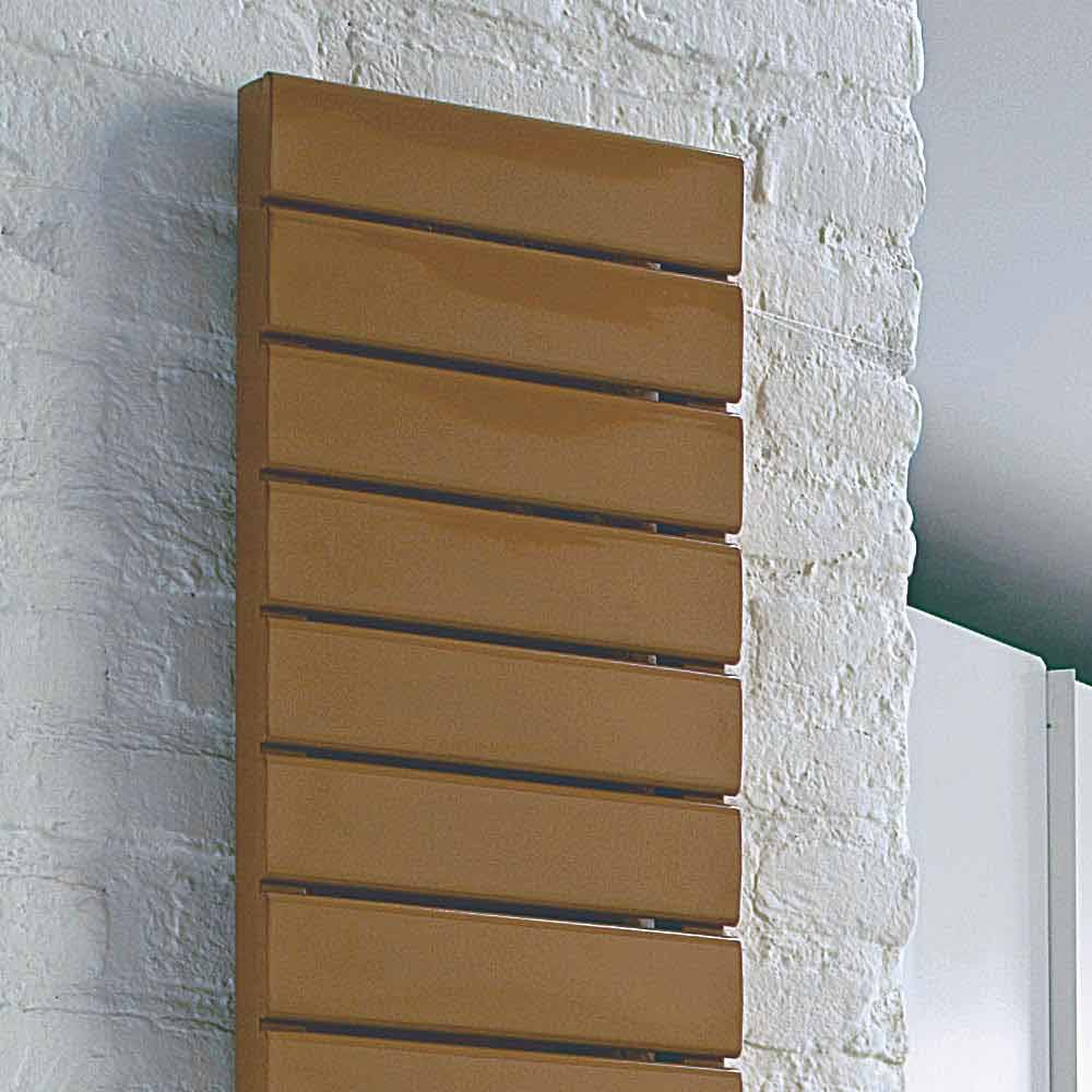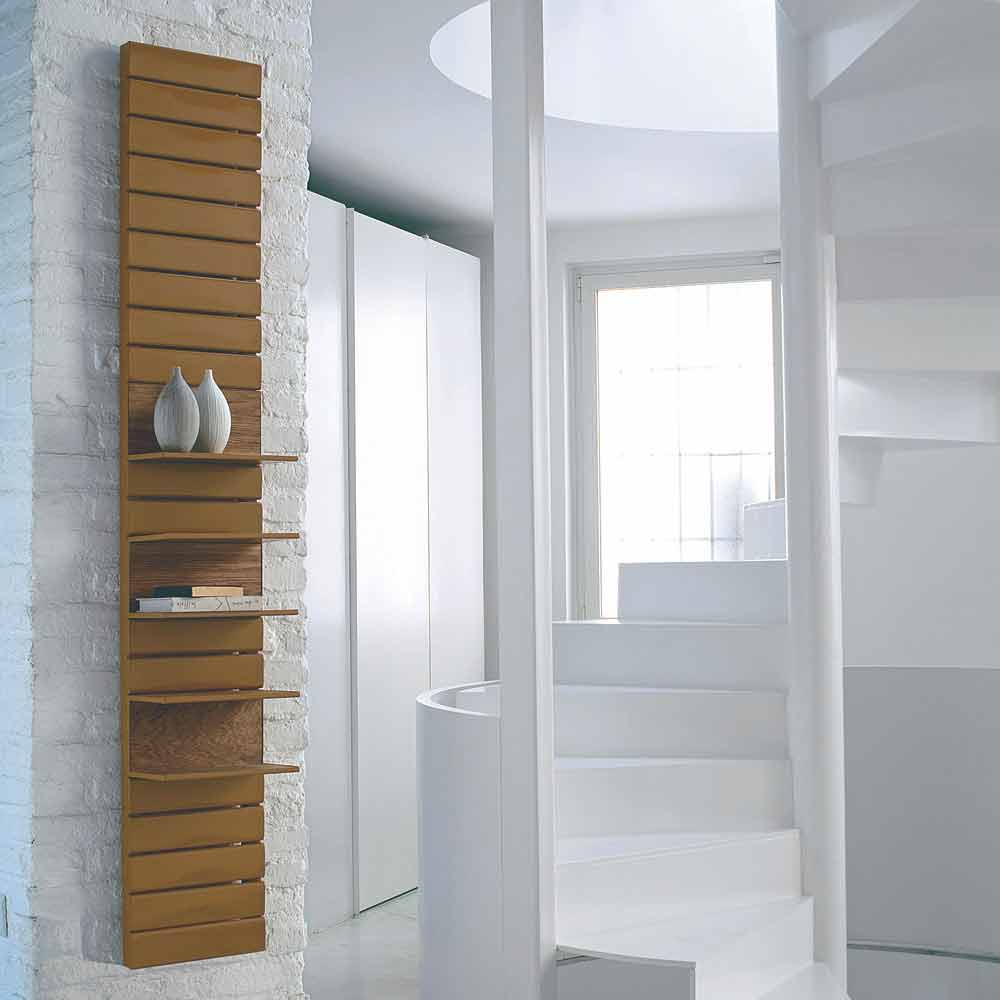Hydraulischer Heizkörper, praktisch und funktional mit linearem Design, heizt und organisiert jede Umgebung, in die er eingebaut wird. Vertikaler Heizkörper aus farbigem Stahl, komplett mit Regalen (wie auf dem Foto gezeigt) mit Rückenlehnenregalen und Oberseite aus natürlicher Eiche.