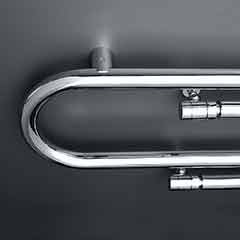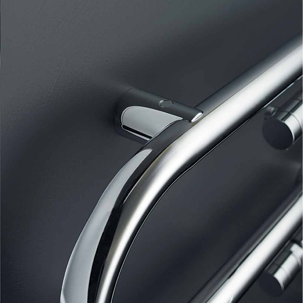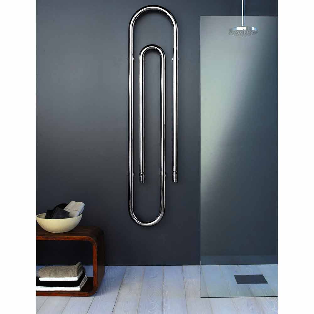 Heizkörper in Form einer horizontalen verchromten Büroklammer, in der hydraulischen Version, mit modernem und lustigem Design. Das Thema ist die Erweiterung der Form von Alltagsgegenständen und ihre Funktionsänderung in einem Spiel der sofortigen Wiedererkennung und Annehmlichkeit. Erhältlich in verschiedenen Größen, wählen Sie diejenige, die am besten zu Ihnen passt!