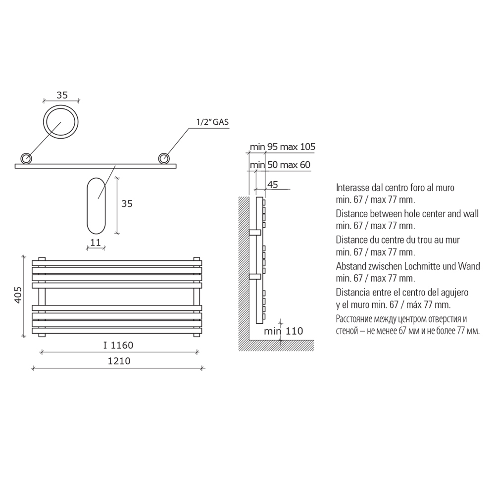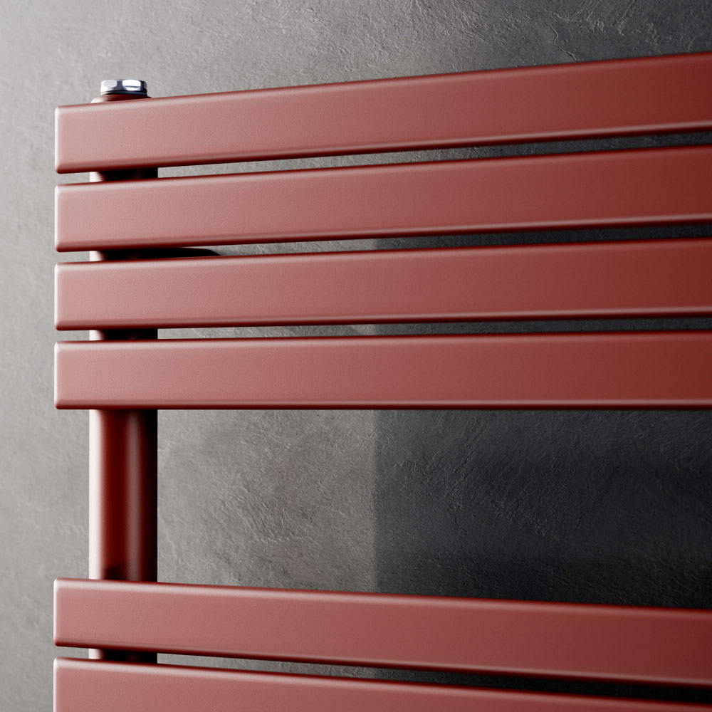 Hydraulischer Handtuchwärmer aus Kohlenstoffstahl mit matter Rostoberfläche, bestehend aus waagerechten Flachrohren 35 x 11 mm und Verteilern mit 35 mm Durchmesser, komplett in Italien hergestellt.