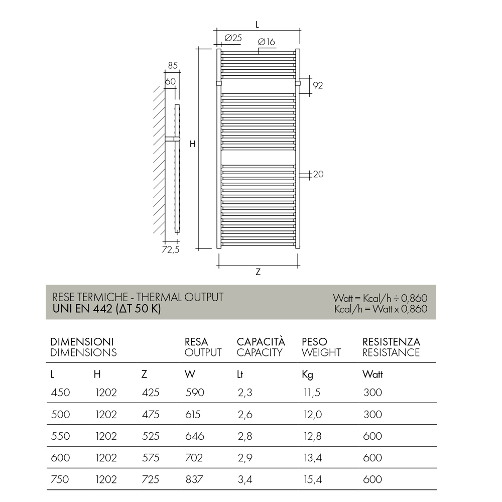 • Länge: 60 cm x Tiefe: 8,5 cm x Höhe: 120,2 cm - Leistung: 702 W - Gewicht: 13,4 kg - Widerstand: 600 Watt - Fassungsvermögen: 2,9 lt