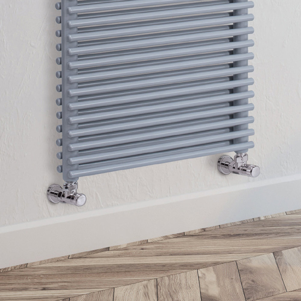 Hydraulischer Handtuchwärmer aus Kohlenstoffstahl mit glänzender Aluminiumoberfläche, bestehend aus einer doppelten Reihe horizontaler Elemente mit einem Durchmesser von 1,6 cm, die an vertikale Verteiler mit einem Durchmesser von 3,5 cm geschweißt sind, vollständig in Italien hergestellt, inklusive Wandbefestigungssatz, Entlüftungsventil und Blindstopfen .