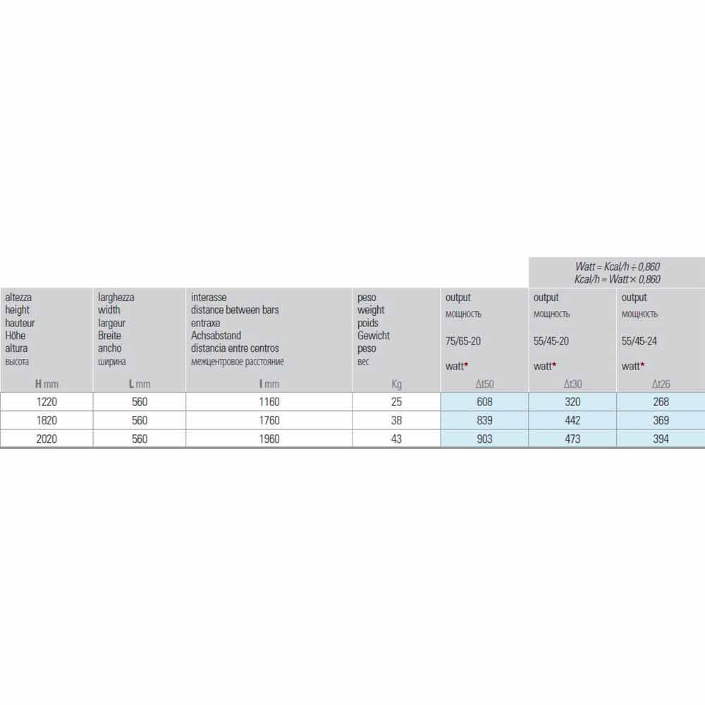 • H 1220 x L 560 x Inter. 1160 mm x Ausgang w (Δt50 *) 608; Ausbeute w (Δt30 *) 320; Ausbeute w (Δt26 *) 268