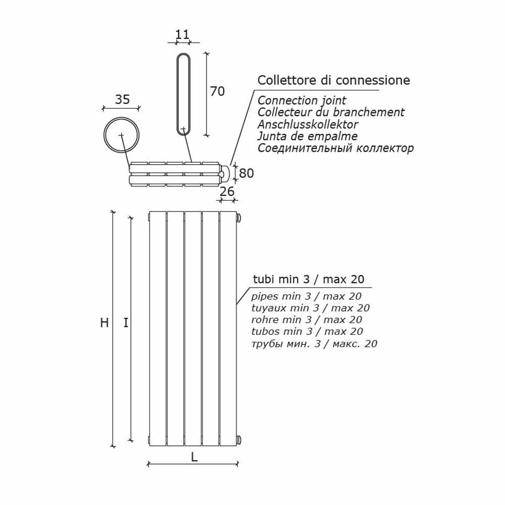 Dieser Kühler verfügt über ein Design, das aus vertikalen Flachrohren mit einer Größe von 70 x 11 mm und Verteilern mit einem Durchmesser von 35 mm besteht.
