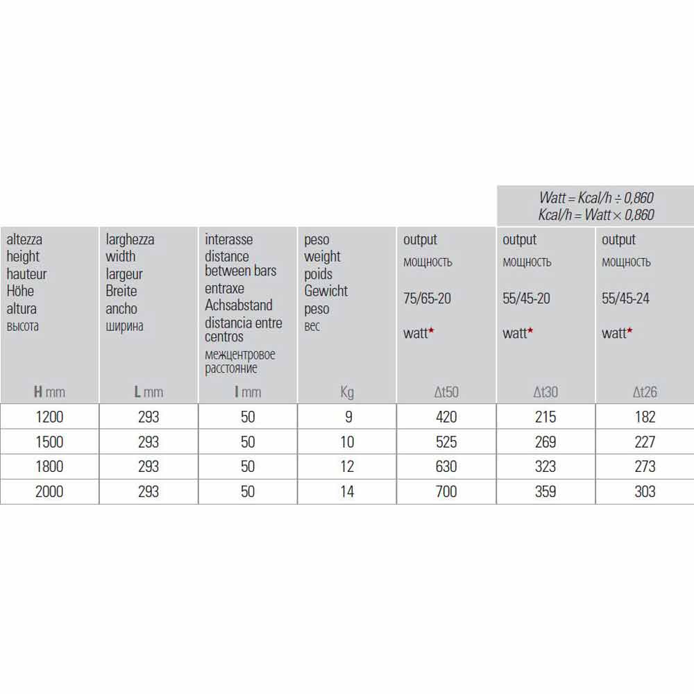 - H 1800 x L 293 x Inter. 50 mm x Ausbeute w (Δt50 *) 630; Ausbeute w (Δt30 *) 323; Ausbeute w (Δ26 *) 273;