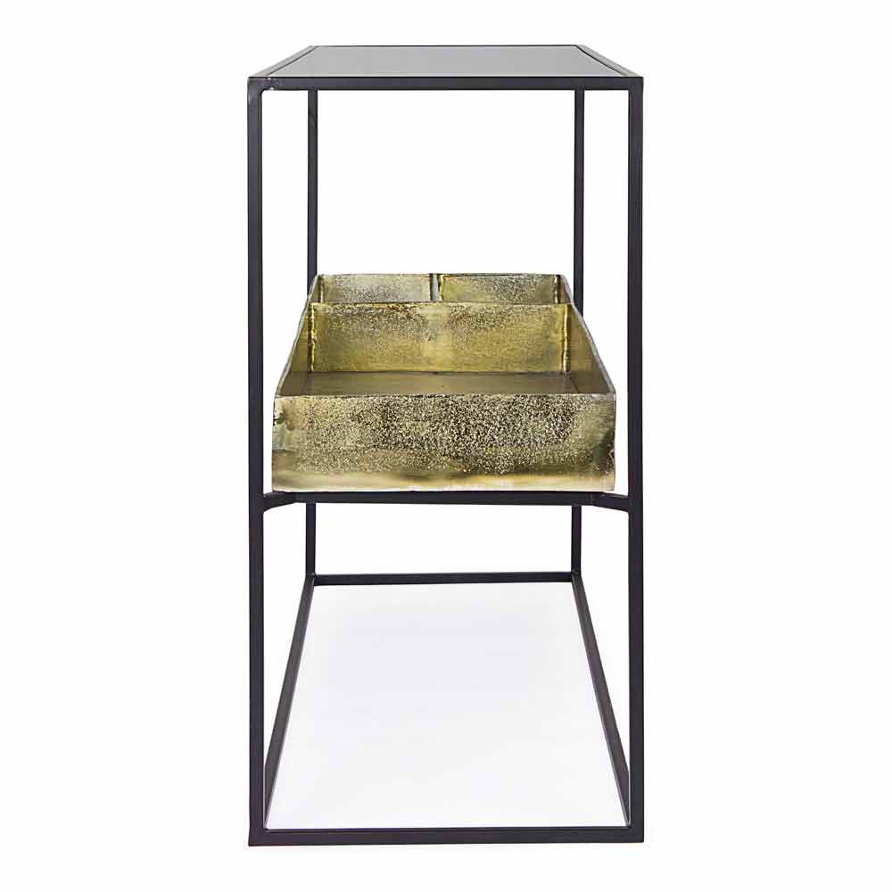 Rechteckige Konsole im Industriestil aus Stahl und Glas mit messingbeschichtetem Behälter.